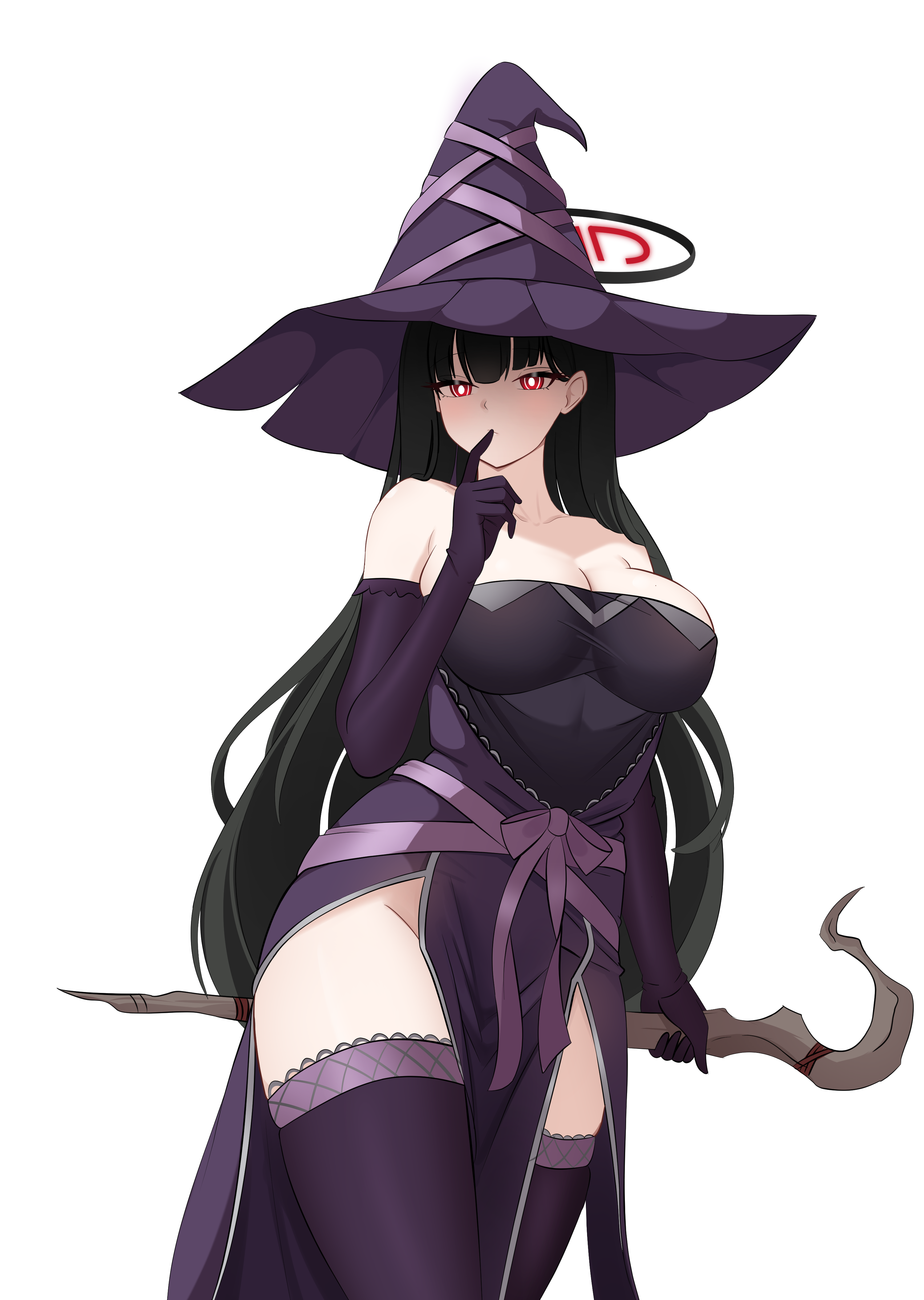 1girl absurdres black_hair black_halo blue_archive breasts bright_pupils cawl commentary dress elbow_gloves english_commentary gloves halo hat highres large_breasts long_hair multicolored_halo pelvic_curtain purple_dress purple_gloves purple_hat purple_thighhighs red_eyes red_halo ringed_eyes rio_(blue_archive) solo strapless strapless_dress thighhighs two-tone_halo very_long_hair white_pupils witch_hat