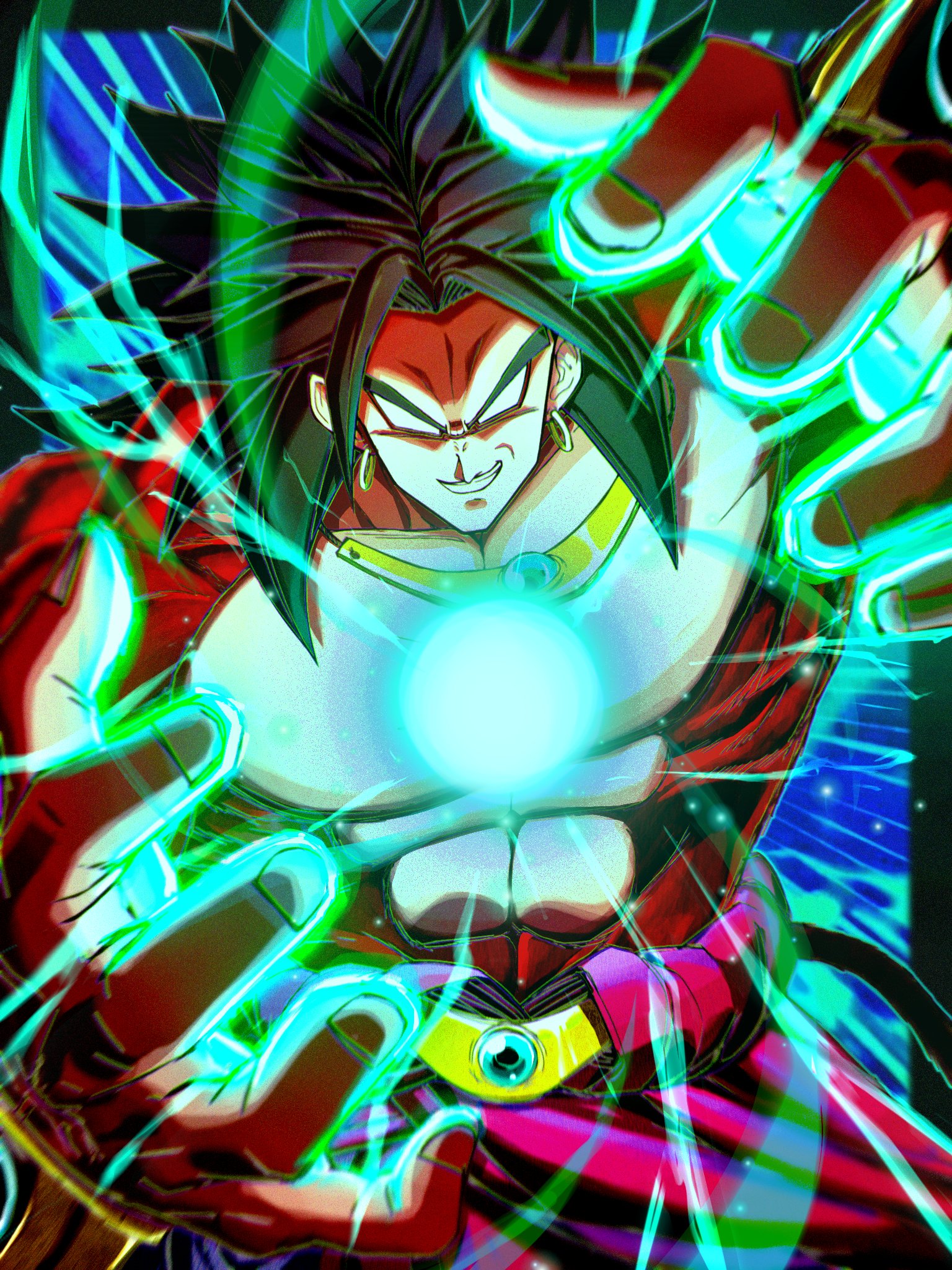 1boy black_border black_hair blue_background body_fur border broly_(dragon_ball_z) commentary_request cowboy_shot dragon_ball dragon_ball_heroes dragonball_z earrings energy_ball highres jewelry male_focus muscular muscular_male no_sclera powering_up red_fur shin_(mrgt2288) solo spiked_hair super_saiyan super_saiyan_4 topless_male