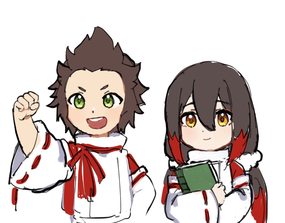 1boy 1girl brother_and_sister brown_hair child green_eyes japanese_clothes long_hair looking_at_viewer momigaramk2 open_mouth red_hair rune_factory rune_factory:_guardians_of_azuma sayo_(rune_factory) siblings teeth umi_(rune_factory) upper_body upper_teeth_only yellow_eyes