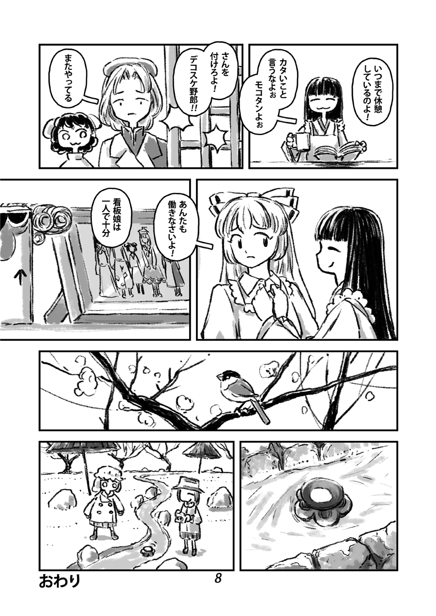 6+girls :3 animal_ears apron bird black_hat book branch closed_mouth coat commentary_request drink fujiwara_no_mokou greyscale hat highres holding holding_book houraisan_kaguya maribel_hearn mob_cap monochrome multiple_girls page_number rabbit_ears reisen_udongein_inaba skirt speech_bubble tataragawa_daini touhou translation_request usami_renko white_hat yagokoro_eirin