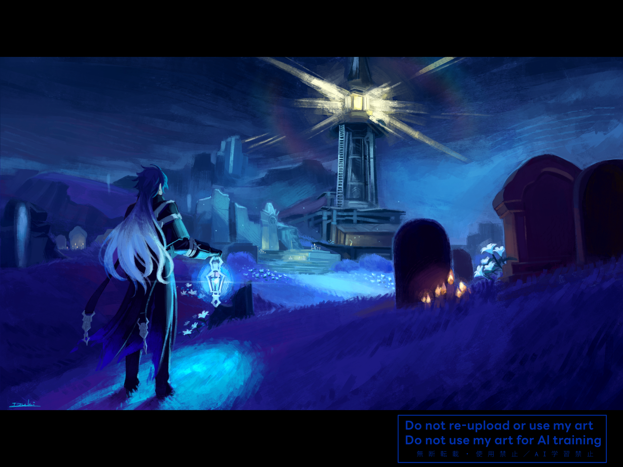 1boy 39_iduki antenna_hair artist_name black_boots black_capelet black_coat black_gloves blue_flower blue_hair boots candle capelet cloud cloudy_sky coat collared_capelet commentary_request facing_away flins_(genshin_impact) flower from_behind genshin_impact gloves glowing_flower gradient_hair grass highres holding holding_lantern in-universe_location lantern letterboxed lighthouse long_hair long_sleeves male_focus multicolored_hair night outdoors scenery sky sleeve_cuffs solo stairs standing statue stone_stairs tombstone very_long_hair watermark