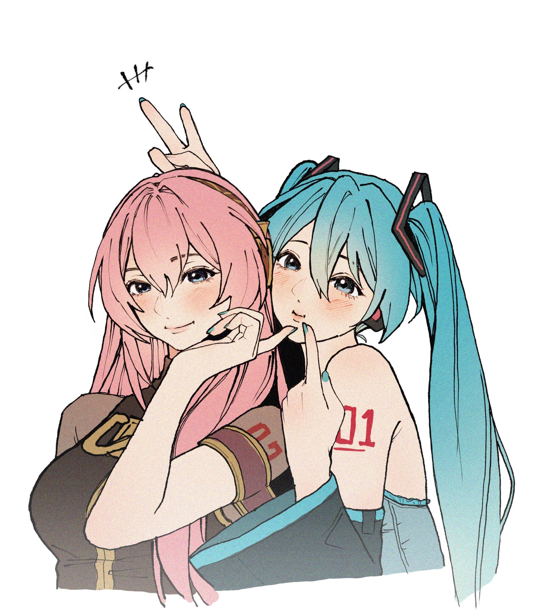 2girls arm_tattoo black_jacket blue_eyes blue_hair blue_shirt blush breasts brown_hairband bunny_ears_prank commentary_request detached_sleeves hair_between_eyes hairband hand_on_another's_chin hatsune_miku highres jacket korean_commentary long_hair looking_at_viewer medium_breasts megurine_luka multiple_girls nata_(na4ta4) pink_hair shirt sleeveless sleeveless_shirt smile tattoo twintails v vocaloid white_background