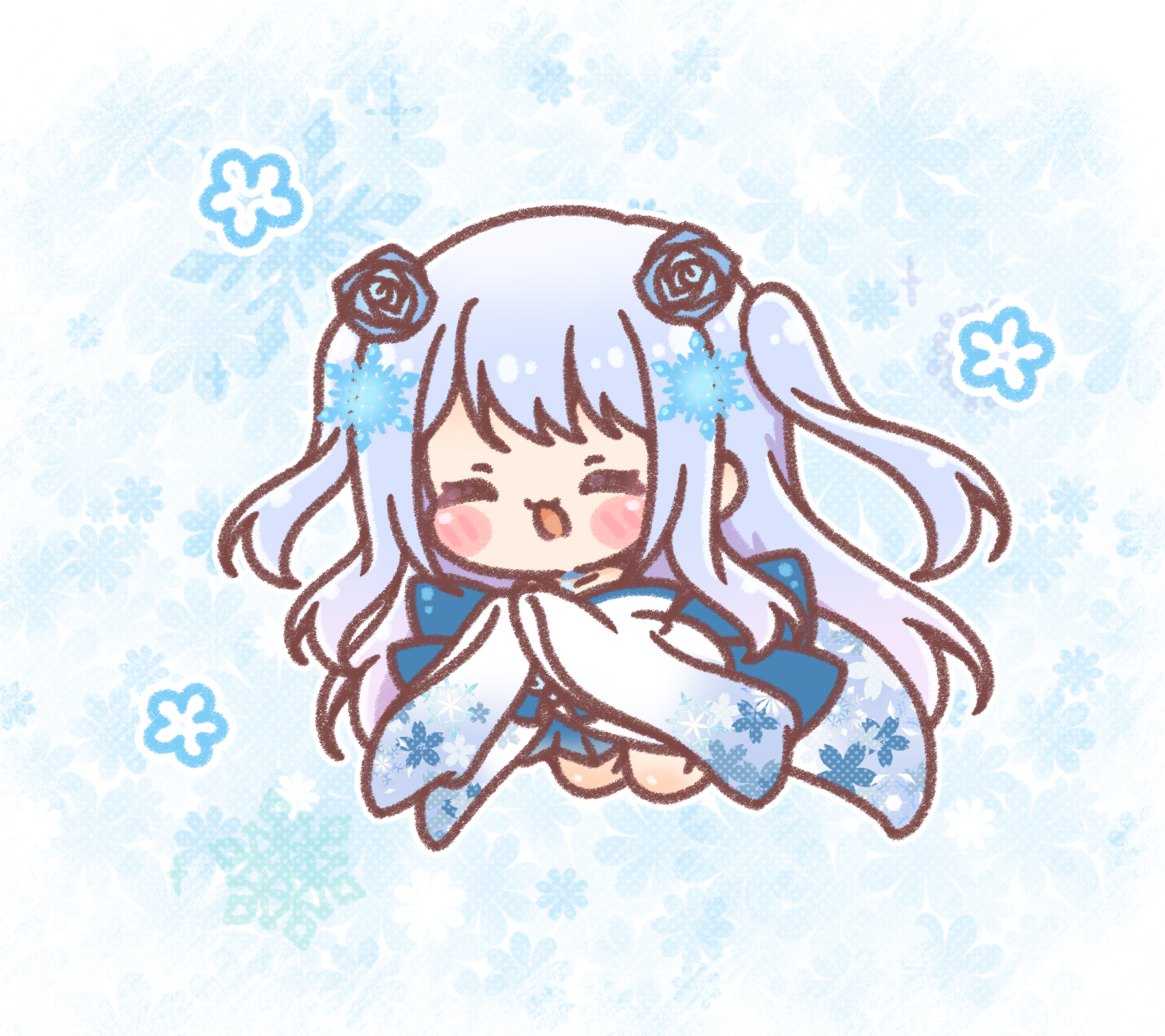 1girl :d ^_^ blue_flower blue_hair blue_kimono blue_rose blue_skirt chibi closed_eyes commentary_request commission floral_background floral_print flower gradient_clothes gradient_kimono hair_flower hair_ornament highres indie_virtual_youtuber japanese_clothes kimono long_hair mitarashi_neko open_mouth pleated_skirt print_kimono rose sayuki_shina skeb_commission skirt sleeves_past_fingers sleeves_past_wrists smile snowflakes solo two_side_up very_long_hair virtual_youtuber white_kimono wide_sleeves
