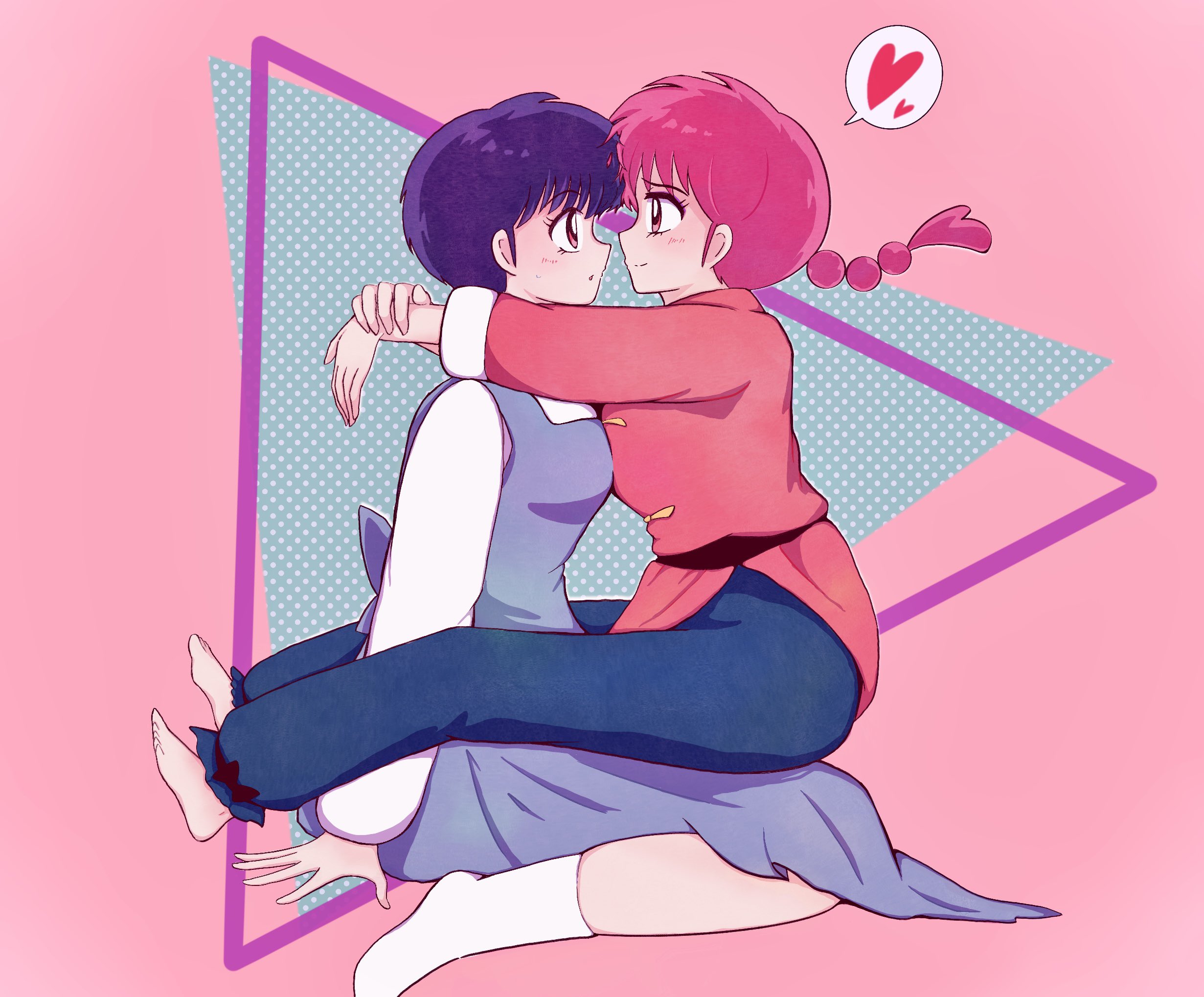 2girls arms_around_neck barefoot blue_dress blue_hair blue_pants braid chinese_clothes commentary dress english_commentary eyeshadow from_side fuurinkan_high_school_uniform heart highres makeup moriya_erichish multiple_girls pants pink_eyes pink_hair purple_eyeshadow ranma-chan ranma_1/2 school_uniform short_hair single_braid sitting sitting_on_lap sitting_on_person smile spoken_heart tendou_akane yuri