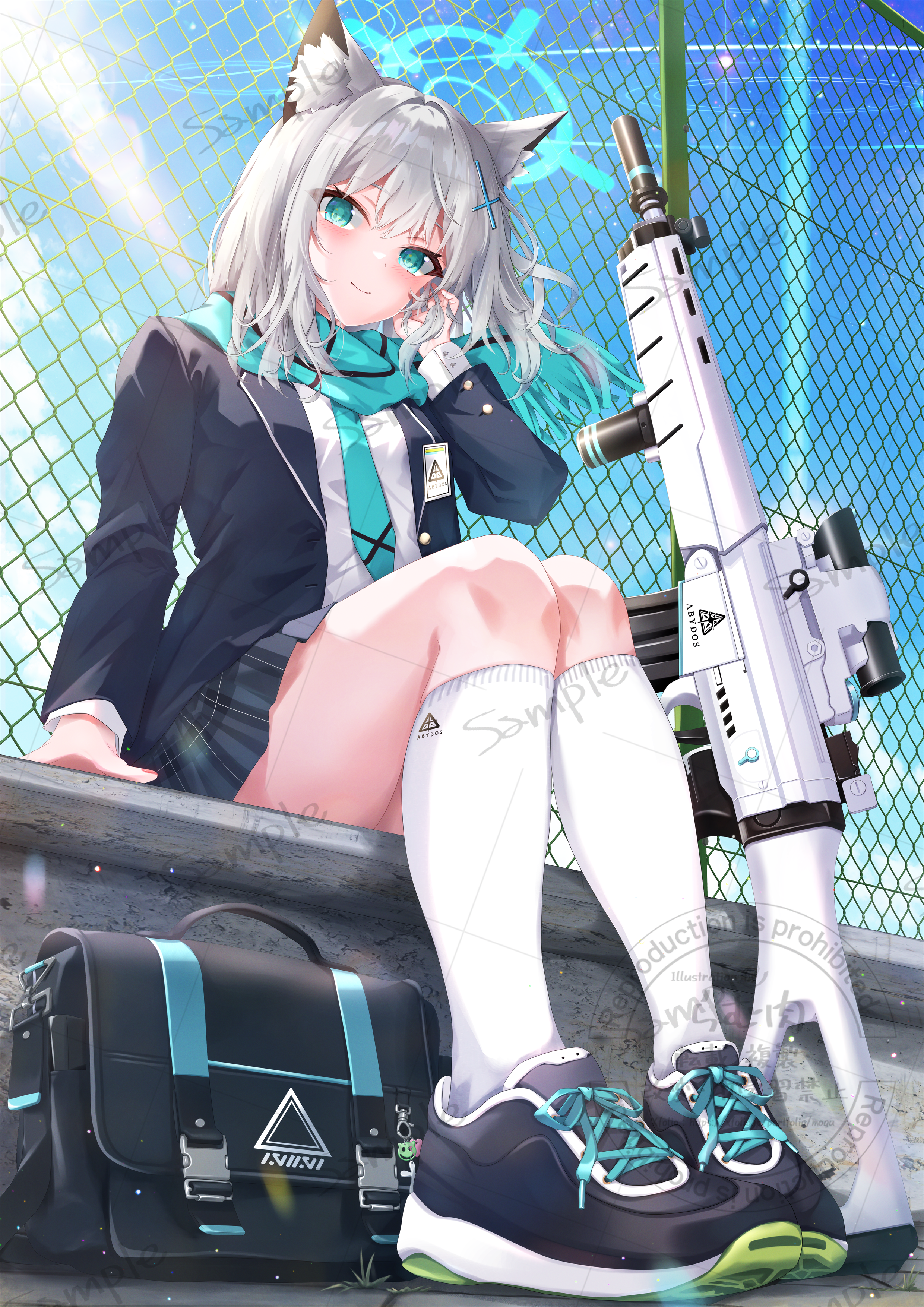 1girl absurdres animal_ear_fluff animal_ears aqua_necktie assault_rifle bag black_jacket black_skirt blue_archive commentary_request cross_hair_ornament fingernails full_body gloves grey_hair gun hair_between_eyes hair_ornament hairclip halo highres jacket kneehighs looking_at_viewer magazine_(weapon) medium_hair mismatched_pupils mogura_mole nail_polish necktie pink_nails pleated_skirt rifle sample_watermark scarf school_bag school_uniform shiroko_(blue_archive) shirt shoes sig_sauer sig_sauer_556 skirt sneakers socks solo trigger_discipline vertical_foregrip watermark weapon white_shirt wolf_ears wolf_girl