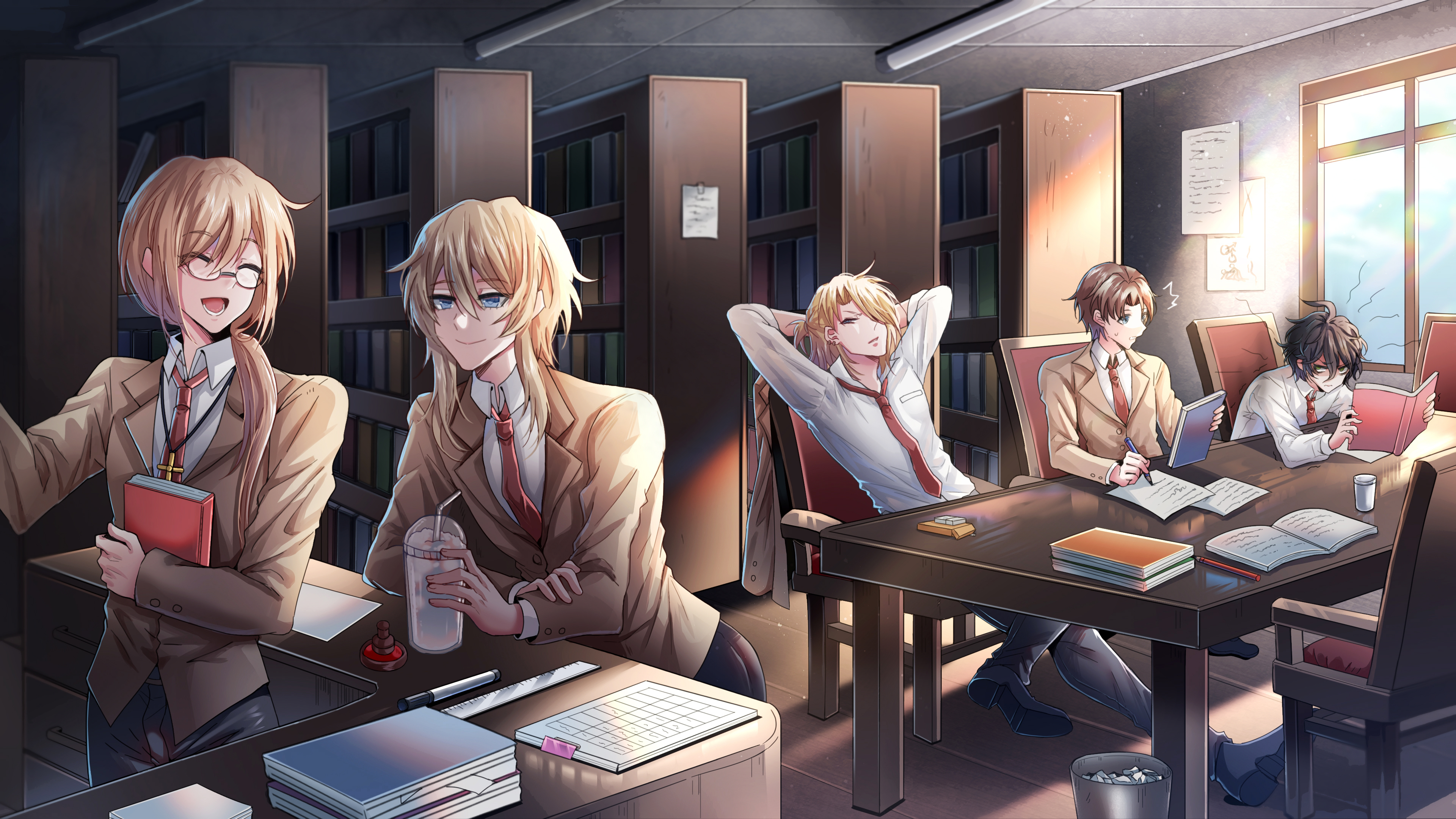 5boys absurdres black_hair black_pants blonde_hair blue_eyes book bookshelf brown_hair chair collared_shirt commentary_request cross cross_necklace cup degrees_of_lewdity disposable_cup earrings glasses green_eyes hair_between_eyes hair_over_one_eye hair_tie highres holding holding_book holding_pen ink_stamp jealous jewelry kylar_(degrees_of_lewdity) kylar_(male)_(degrees_of_lewdity) library multiple_boys necklace necktie nga_(ray_ray) open_mouth pants pen pencil player_character_(degrees_of_lewdity) player_character_(male)_(degrees_of_lewdity) red_necktie robin_(degrees_of_lewdity) robin_(male)_(degrees_of_lewdity) ruler school_uniform shirt sitting smile sydney_(degrees_of_lewdity) sydney_(male)_(degrees_of_lewdity) table trash_can white_shirt whitney_(degrees_of_lewdity) whitney_(male)_(degrees_of_lewdity) window