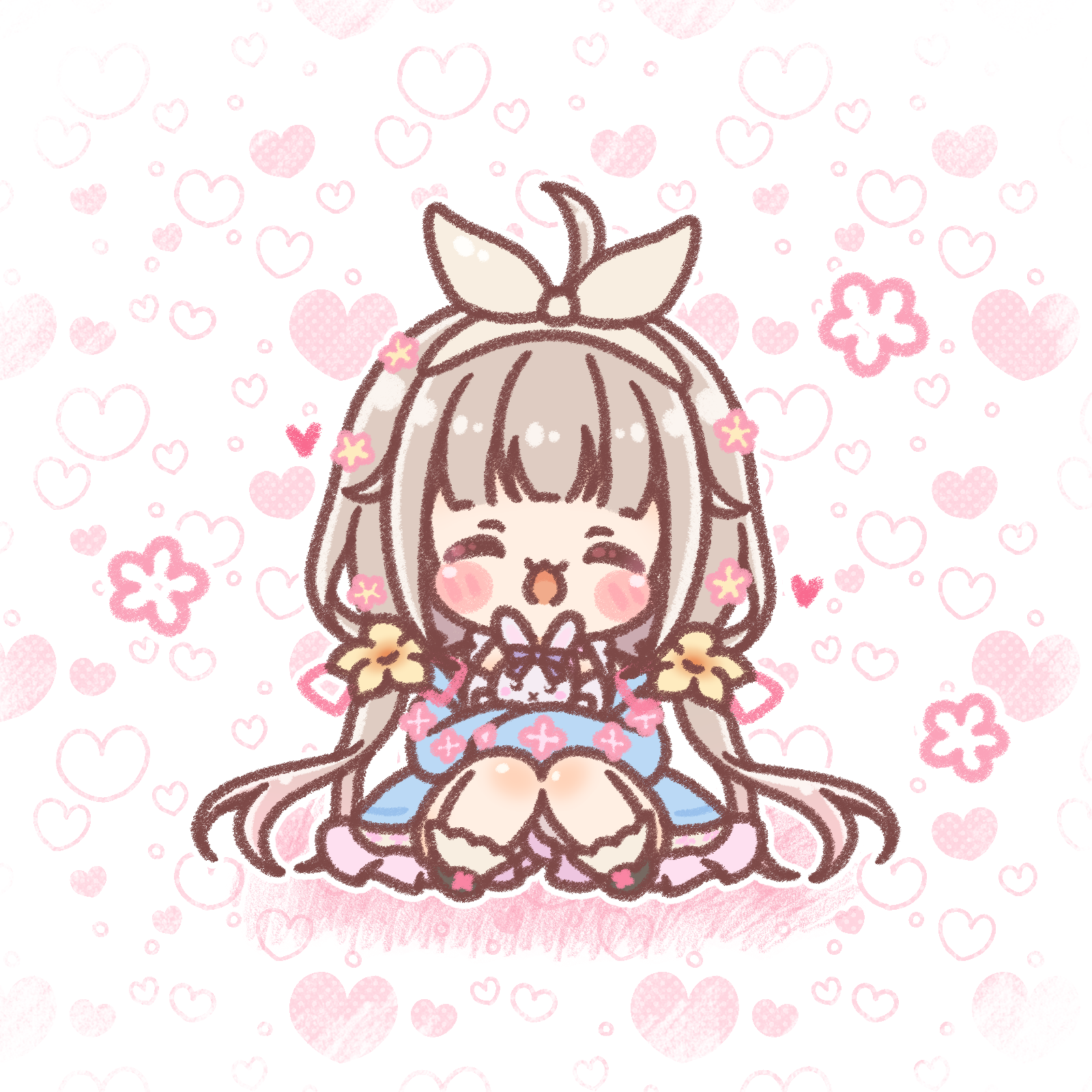 1girl :d ^_^ ahoge black_shoes blue_dress brown_hair brown_hairband brown_ribbon chibi closed_eyes colored_shadow commentary_request commission dress facing_viewer hair_ribbon hairband hanakumo_rin_(vtuber) heart heart_background highres knees_together_feet_apart knees_up long_hair long_sleeves low_twintails mitarashi_neko open_mouth propro_production ribbon shadow shoes sitting skeb_commission sleeves_past_fingers sleeves_past_wrists smile solo stuffed_animal stuffed_rabbit stuffed_toy twintails very_long_hair virtual_youtuber white_background x_mouth