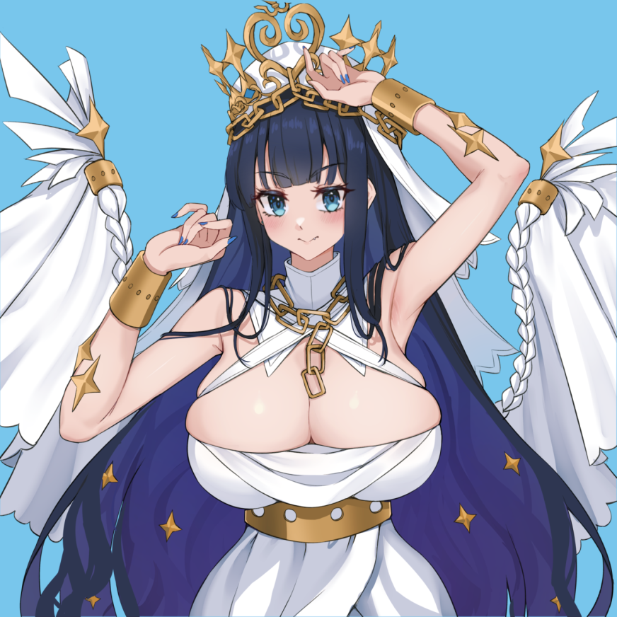 armpits arms_up blue_eyes blue_hair breasts cleavage crown dress headdress hololive hololive_english large_breasts ouro_kronii ouro_kronii_(goddess) ranox virtual_youtuber