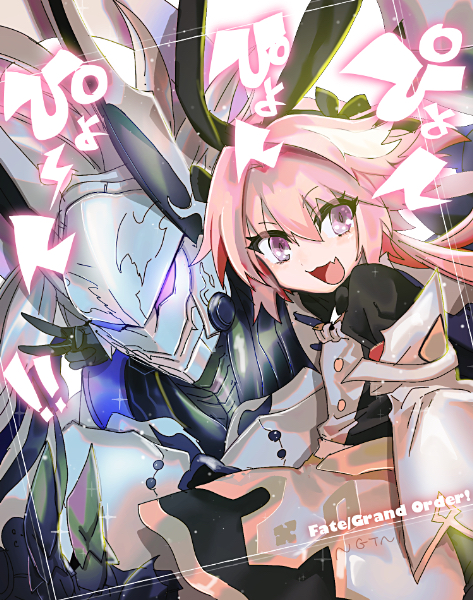 2boys armor astolfo_(fate) black_hairband bow_hairband commentary_request copyright_name eyelashes fang fate/grand_order fate_(series) full_armor hair_between_eyes hairband helmet long_hair looking_at_viewer male_focus minamoto_no_tametomo_(fate) multiple_boys nonono_nagata open_mouth pink_hair skin_fang trap