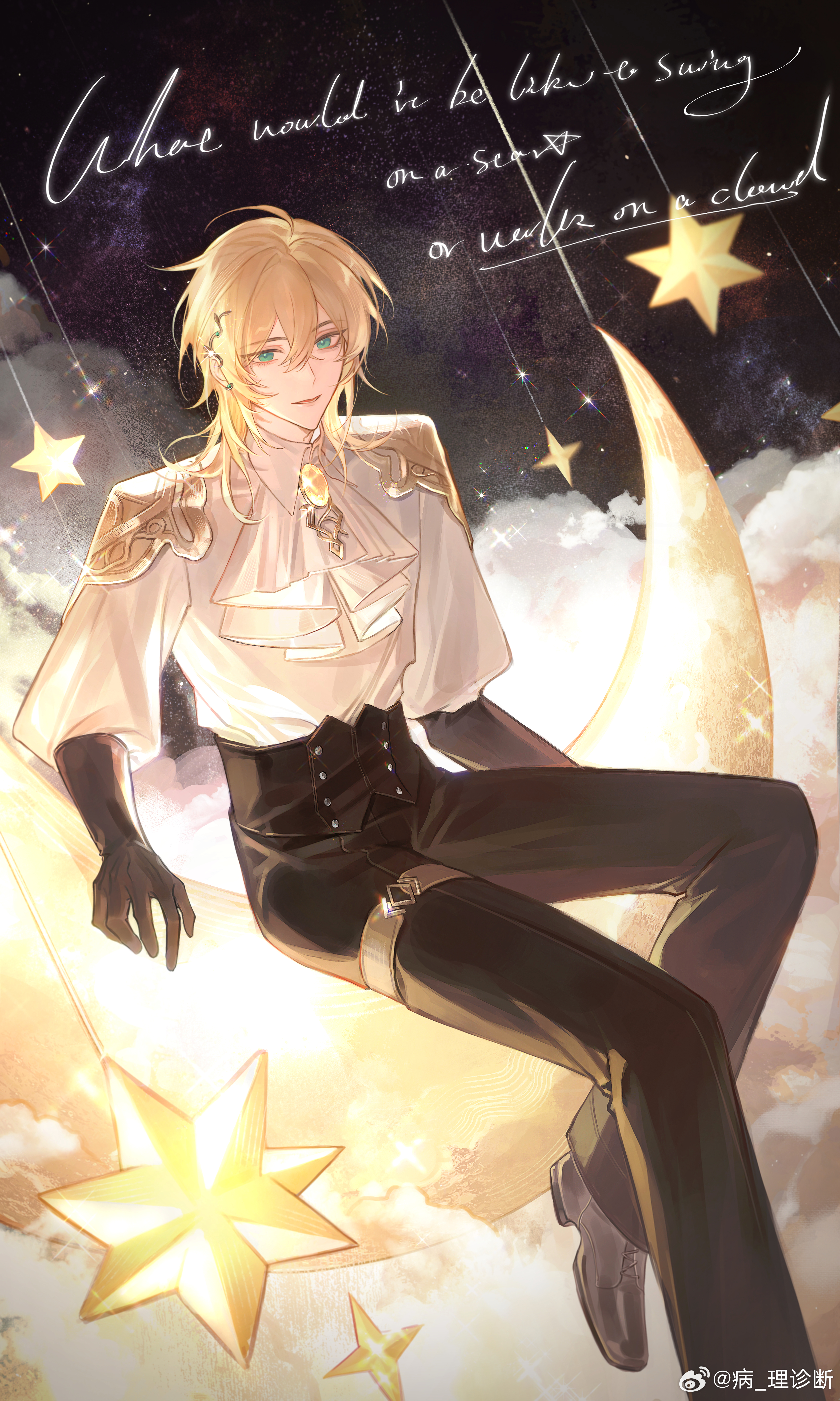 1boy above_clouds absurdres ahoge alkaid_mcgrath ascot black_gloves black_pants blonde_hair brooch buttons chinese_commentary cloud collared_shirt commentary_request double-breasted ear_covers elbow_gloves english_text foot_out_of_frame gem gloves green_eyes grey_shoes hair_between_eyes high-waist_pants highres jewelry light_particles long_sleeves looking_at_viewer lovebrush_chronicles male_focus medium_hair on_crescent oxfords pants parted_lips pathologicaldiagnosis puffy_sleeves shirt shirt_tucked_in shoes shooting_star shoulder_guard sitting sky smile solo star_(sky) star_(symbol) starry_sky stellated_octahedron thigh_strap watermark weibo_watermark white_ascot white_shirt yellow_gem