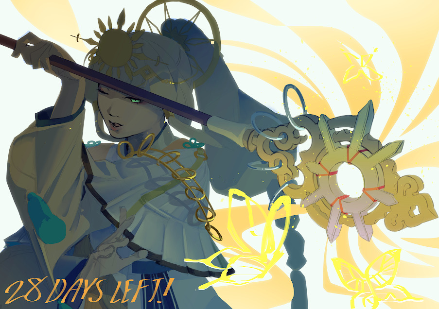 1girl countdown hair_tubes head_chain holding holding_staff japanese_clothes jewelry kanata_(rune_factory) metal_hair_tubes moufionn rune_factory rune_factory:_guardians_of_azuma second-party_source staff sun_hair_ornament