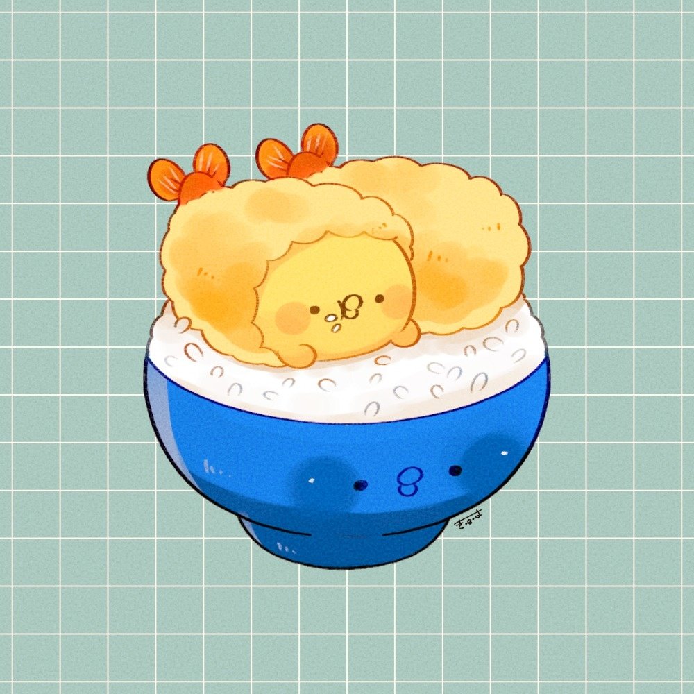 baby_animal bird blush_stickers bowl chick commentary food food_focus food_on_face green_background grid_background in_food kimipiyo_(tenmiyakiyo) no_humans original rice rice_bowl shrimp shrimp_tempura signature solid_circle_eyes tempura tenmiyakiyo