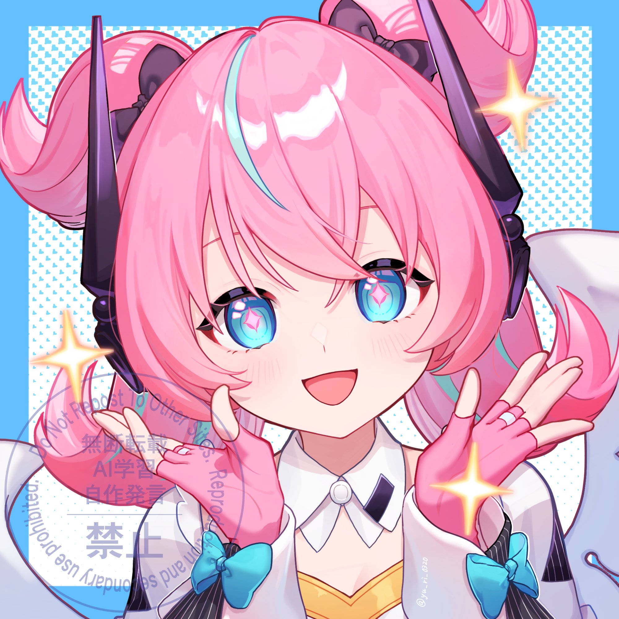 1girl :d aria_(zenless_zone_zero) black_bow blue_border blue_bow blue_eyes blue_streaks blush border bow collared_shirt crossed_bangs fingerless_gloves gloves hair_between_eyes hair_bow hands_up highres long_sleeves looking_at_viewer multicolored_hair open_mouth outside_border pink_gloves pink_hair portrait quad_tails shirt short_hair sleeve_bow smile solo sparkle streaked_hair watermark white_background white_shirt yu_ri_0320 zenless_zone_zero