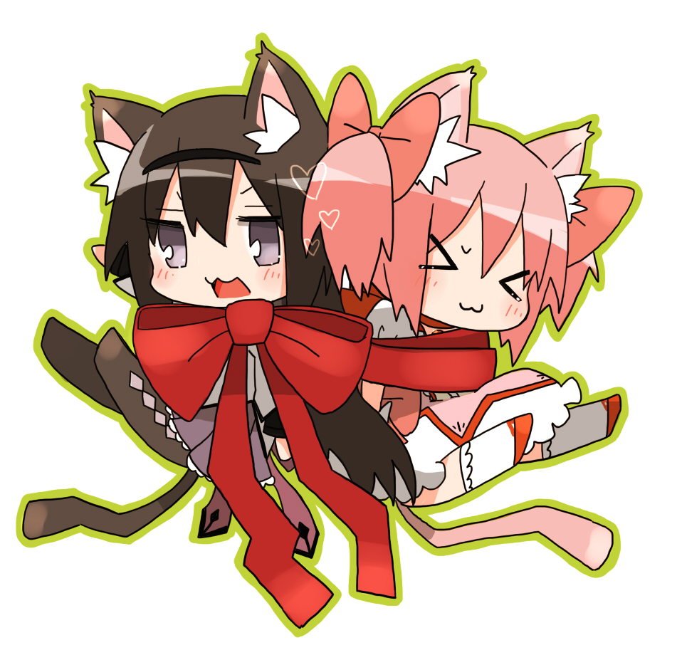 >_< 2girls :3 akemi_homura animal_ears black_hair cat_ears cat_tail chibi chibi_only chuu-son closed_mouth commentary_request full_body green_outline kaname_madoka kemonomimi_mode magical_girl mahou_shoujo_madoka_magica multiple_girls open_mouth outline pink_hair red_ribbon ribbon tail