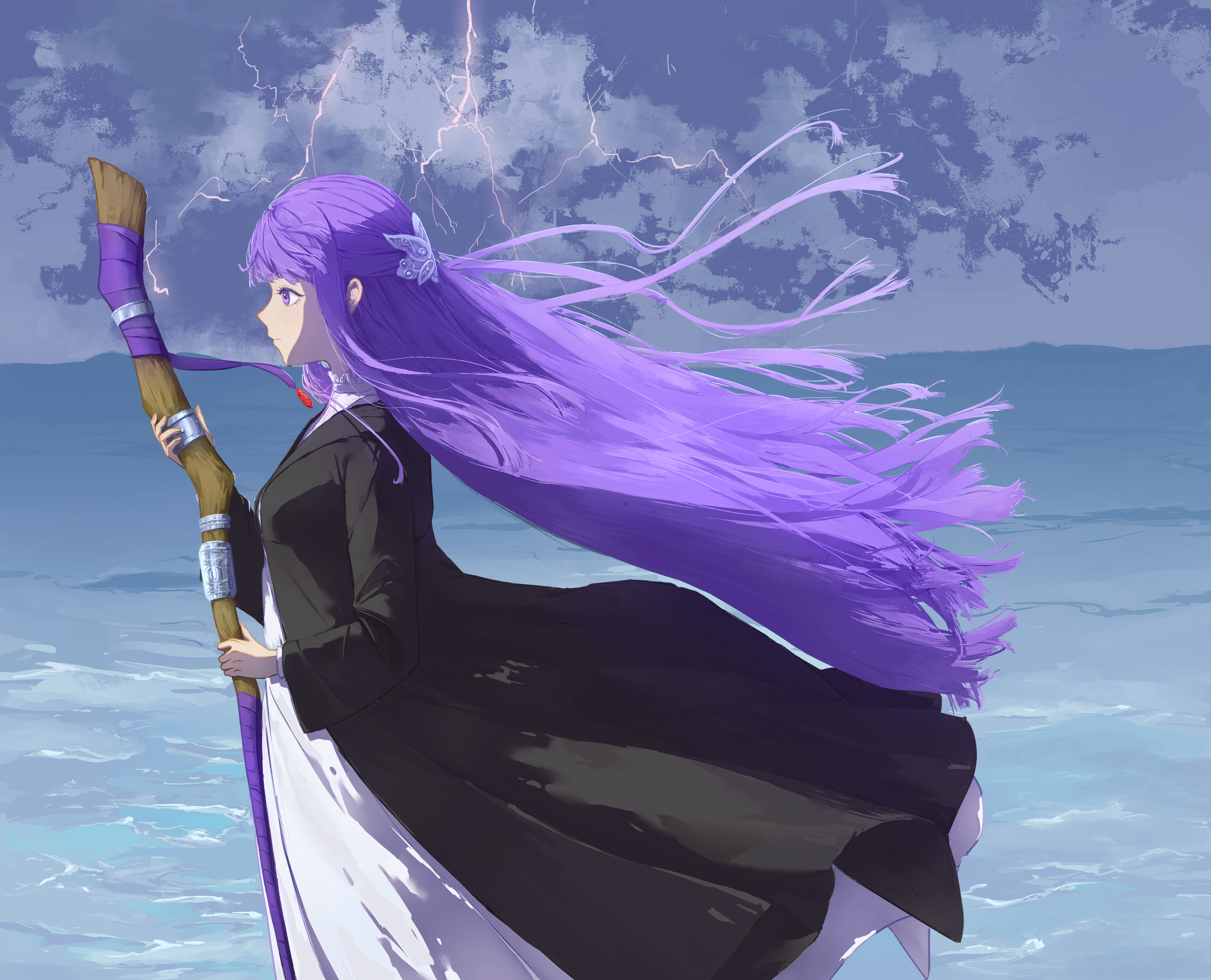 1girl absurdres black_coat butterfly_hair_ornament chinese_commentary closed_mouth cloud cloudy_sky coat commentary_request day dress expressionless feet_out_of_frame fern_(sousou_no_frieren) floating_hair from_side hair_ornament half_updo highres holding holding_staff horizon layered_sleeves lightning long_hair long_sleeves mage_staff ocean open_clothes open_coat outdoors profile purple_eyes purple_hair sky solo sousou_no_frieren staff standing straight_hair very_long_hair white_dress youfengtian