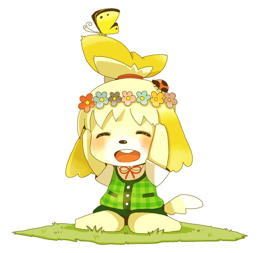 1girl animal_crossing bug butterfly chuu-son closed_eyes commentary_request dog_girl full_body furry furry_female grass green_vest head_wreath insect isabelle_(animal_crossing) kneeling ladybug nintendo open_mouth shirt simple_background solo vest white_background white_shirt yellow_butterfly
