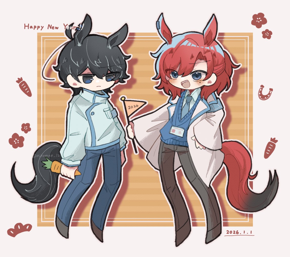 2boys :d animal_ear_piercing armband black_hair black_tail blue_armband blue_necktie blue_pants blue_shirt blue_sweater blush carrot chinese_zodiac coat collared_shirt commentary_request dated dress_shirt extra_ears flag full_body gradient_tail half_updo happy_new_year holding holding_carrot holding_flag horse_boy hyoutenka_30-do_no_zetsubou kuchinashi_dabi legs_apart mole mole_under_eye multiple_boys necktie new_year ninomae_126 open_mouth pants sharp_teeth shirt smile standing sweater teeth tonimura_yui white_coat year_of_the_horse