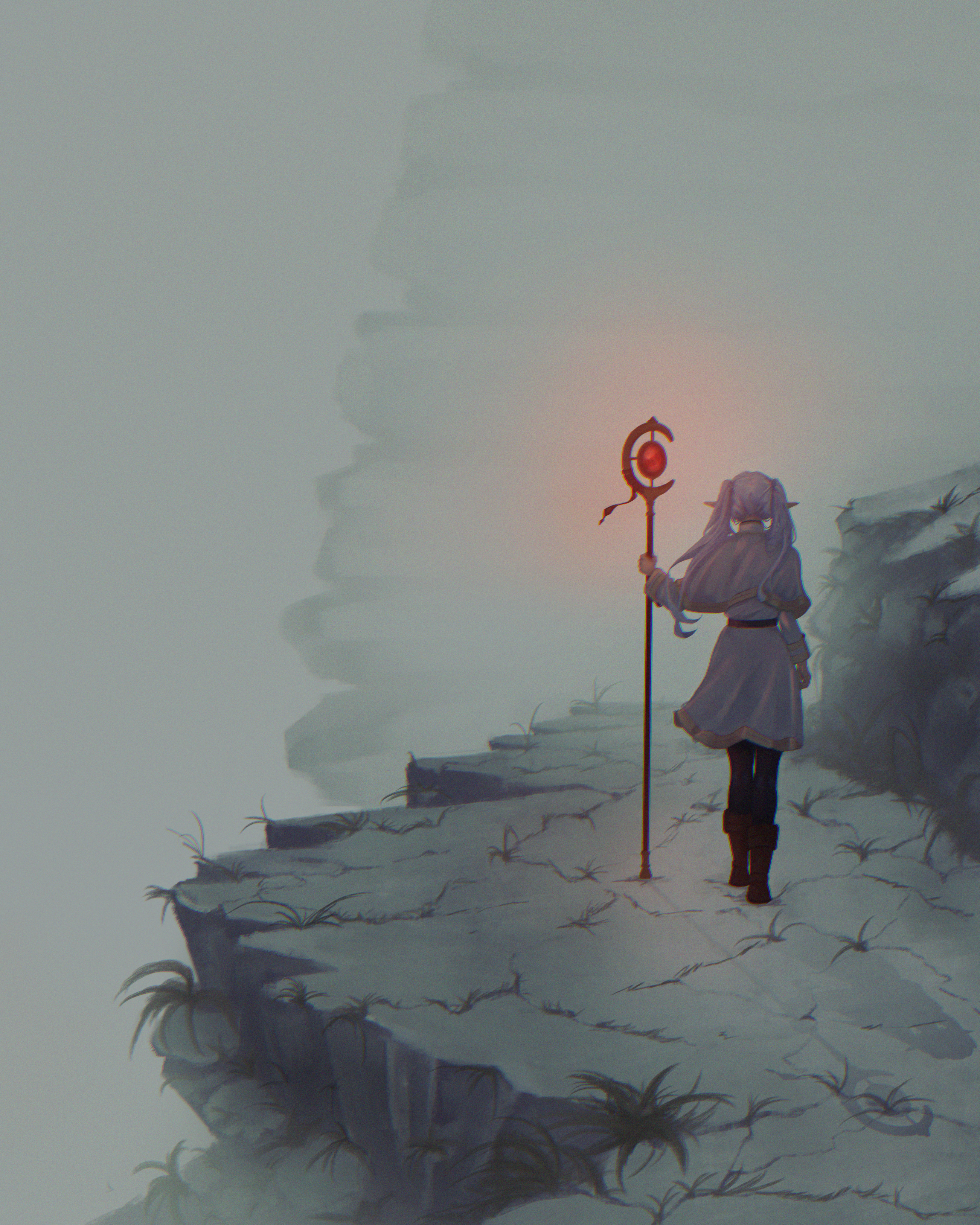 1girl absurdres black_boots black_pantyhose boots capelet cliff commentary elf facing_away fog frieren from_behind full_body grass highres holding holding_staff long_hair long_sleeves mage_staff pantyhose pointy_ears shadow skirt solo sousou_no_frieren staff twintails walking white_capelet white_hair white_skirt xzyle_neo