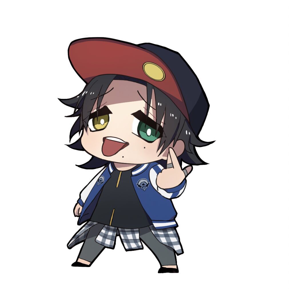 1boy baseball_cap black_hair black_shirt blue_jacket chibi chibi_only commentary_request full_body green_eyes grey_pants hat hypnosis_mic icysgmf jacket looking_at_viewer male_focus mole mole_on_cheek mole_under_mouth multiple_moles no_nose open_mouth pants shirt simple_background solo tongue tongue_out white_background yamada_jiro yellow_eyes