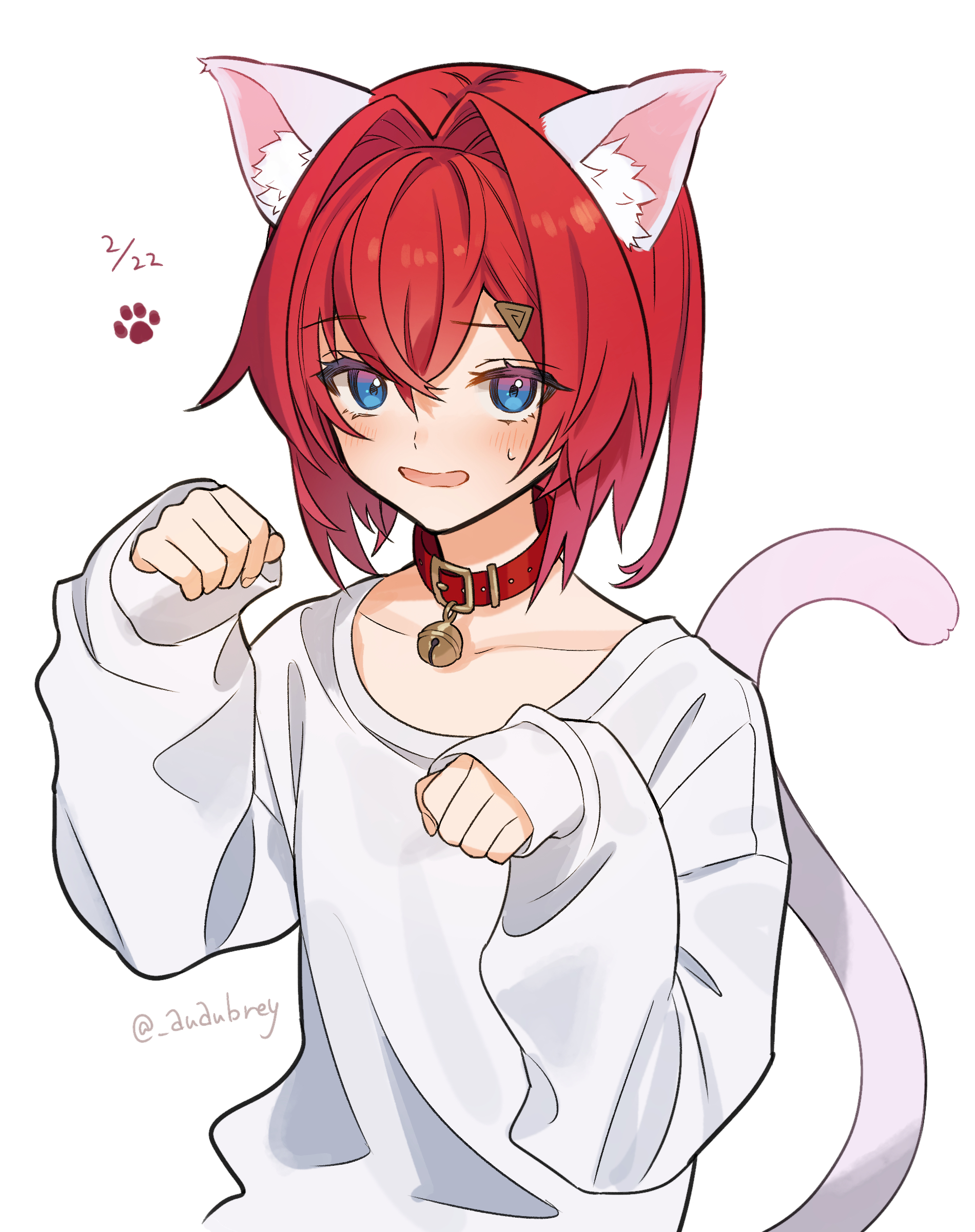 1girl absurdres alternate_costume ange_katrina animal_ear_fluff animal_ears aubrey_(kyarairo) bell blue_eyes blush cat_ears cat_girl cat_tail collar collarbone commentary_request dated embarrassed gradient_eyes hair_between_eyes hair_ornament hands_up highres jingle_bell kemonomimi_mode looking_at_viewer medium_hair multicolored_eyes neck_bell nervous_smile nijisanji open_mouth paw_pose paw_print purple_eyes red_collar red_hair simple_background sleeves_past_wrists smile solo sweatdrop sweater tail triangle_hair_ornament twitter_username upper_body virtual_youtuber white_background white_sweater white_tail