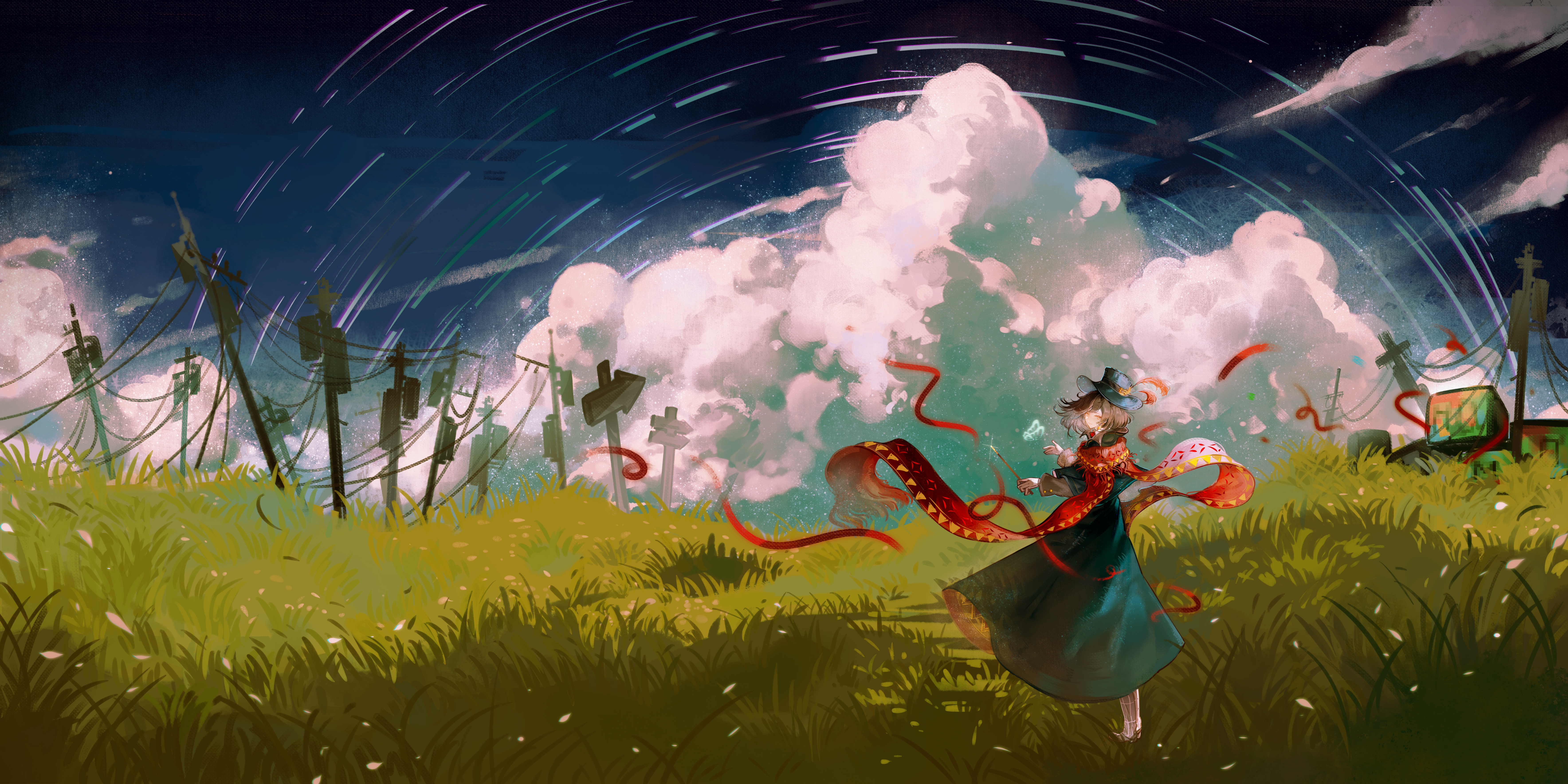 1boy absurdres black_coat black_hair black_hat chinese_commentary cloud cloudy_sky coat commentary_request crt cumulonimbus_cloud eclia field floating_clothes from_side grass hat highres holding holding_wand klein_moretti long_scarf lord_of_the_mysteries magician's_wand male_focus merlin_hermes outdoors power_lines red_scarf ribbon scarf short_hair sky solo standing star_trail utility_pole wand wide_shot wind