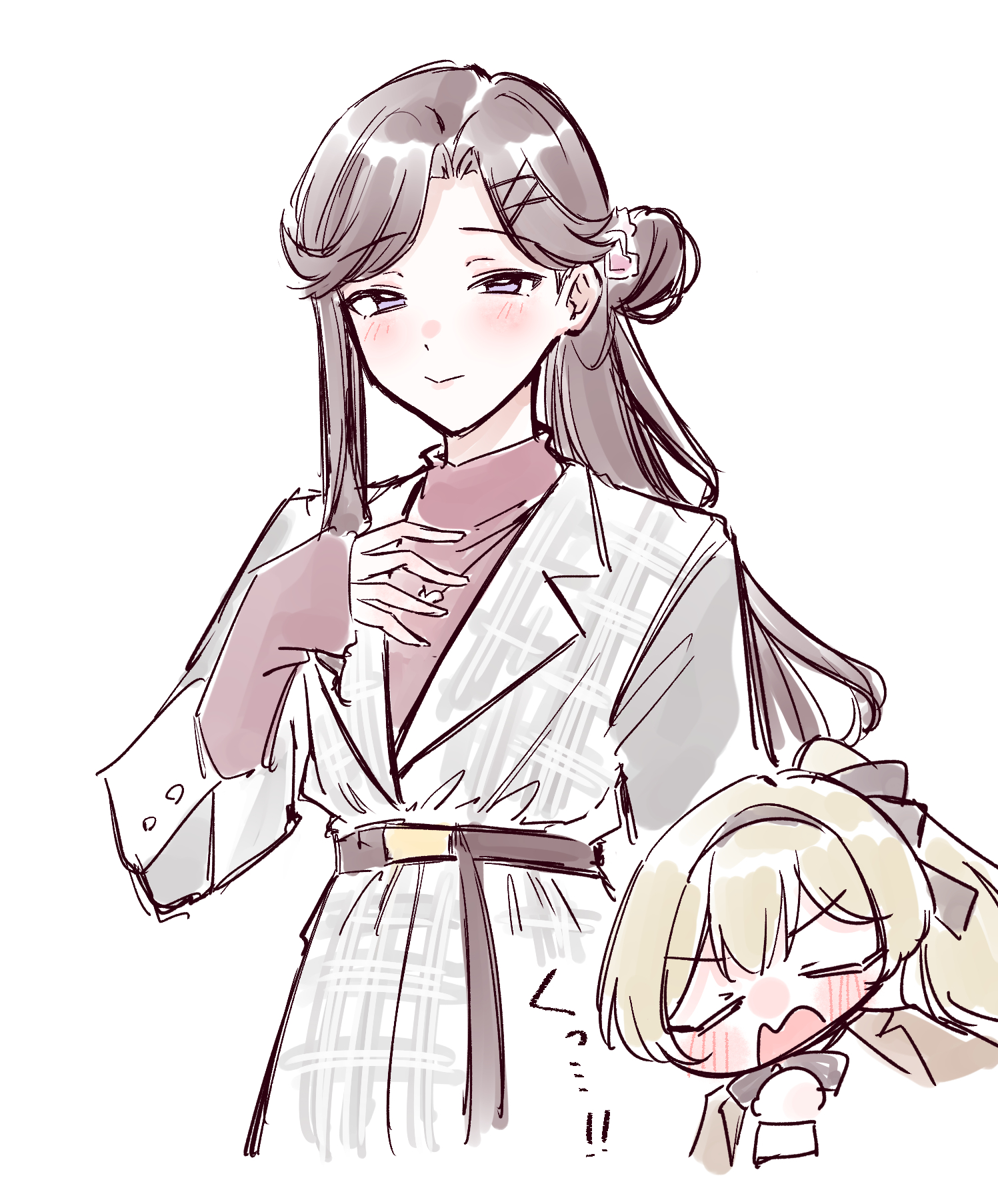 2girls arm_at_side belt belt_buckle black_belt black_bow black_bowtie black_hairband black_ribbon blonde_hair blush bow bowtie brown_hair brown_jacket buckle chibi chibi_inset closed_eyes closed_mouth commentary cropped_torso grey_jacket hair_bun hair_ornament hair_ribbon hairband half-closed_eyes hand_on_own_chest hand_up heart heart_hair_ornament high_belt high_ponytail highres jacket jewelry layered_sleeves long_hair long_sleeves looking_at_viewer multiple_girls necklace official_alternate_costume official_alternate_hairstyle open_mouth parted_bangs plaid_clothes plaid_jacket ponytail purple_eyes red_sweater ribbon saijo_claudine shoujo_kageki_revue_starlight simple_background single_side_bun sleeves_past_wrists smile sweater tendo_maya translation_request upper_body v-shaped_eyebrows very_long_hair wavy_mouth white_background x_hair_ornament zangemiya