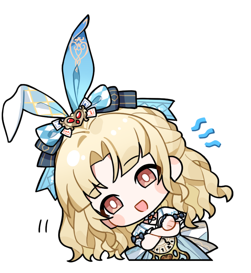 1girl animal_ear_hairband animal_ears argyle_bow artist_request back_bow black_bow blonde_hair blue_bow blue_hairband blue_skirt blunt_bangs blush_stickers bow bright_pupils brown_eyes chibi choker clock clock_print cropped_legs crossed_arms dress_shirt fake_animal_ears floppy_ears frilled_sleeves frilled_wrist_cuffs frills hair_bow hair_ornament hairband heart heart_choker heart_hair_ornament high-waist_skirt infinity_nikki leaning_to_the_side lolita_fashion long_hair looking_at_viewer motion_lines nikki_(series) official_art open_mouth parted_bangs print_skirt puffy_short_sleeves puffy_sleeves rabbit_ear_hairband rabbit_ears rewound_daydream_(infinity_nikki) shirt short_sleeves shout_lines skirt sleeve_bow smile smug solo sticker_(medium) tareme transparent_background two-tone_bow v-neck wavy_hair white_choker white_pupils white_shirt white_wrist_cuffs wrist_cuffs