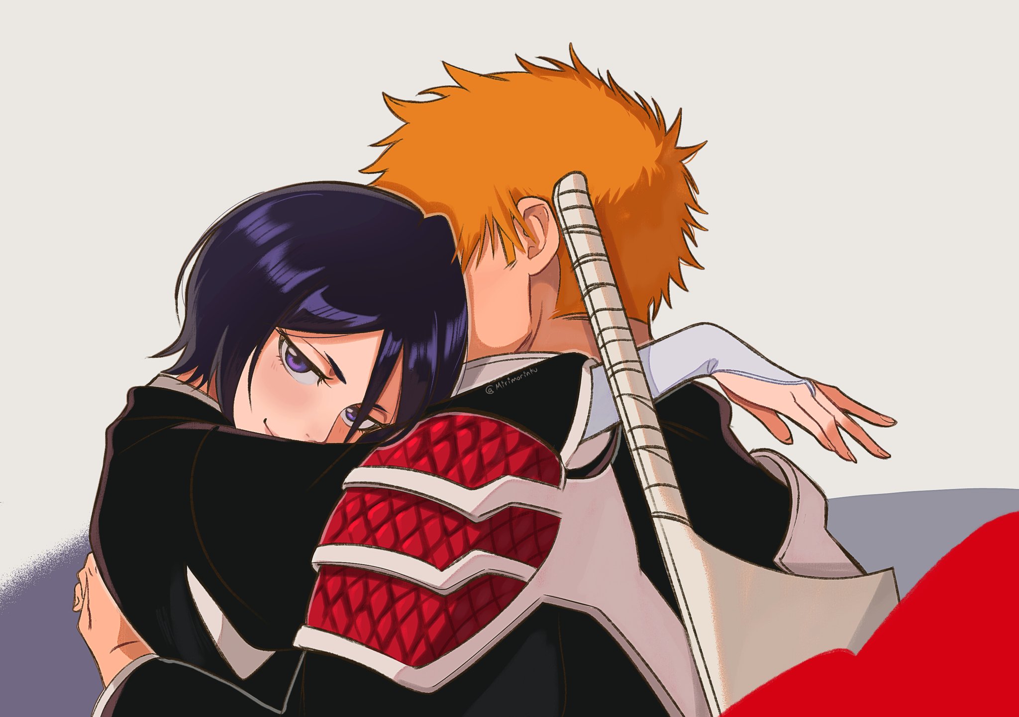 1boy 1girl armor bleach bleach:_sennen_kessen-hen bridal_gauntlets commentary highres hug japanese_clothes kuchiki_rukia kurosaki_ichigo m1rimorinku naughty_face orange_hair pauldrons purple_eyes purple_hair shihakusho short_eyebrows shoulder_armor smile sword sword_on_back twitter_username weapon weapon_on_back white_bridal_gauntlets zangetsu_(shikai)