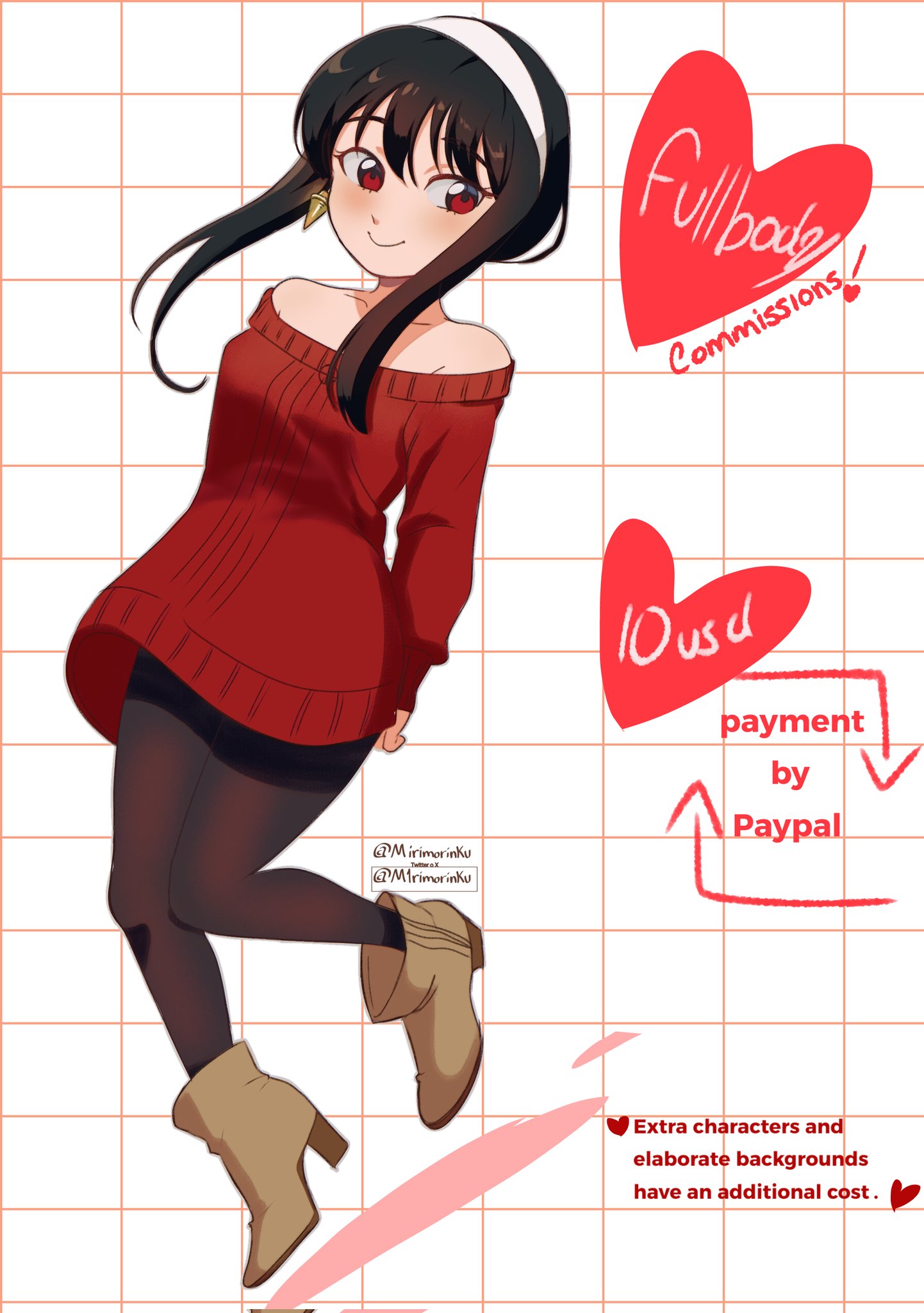 1girl arms_behind_back bare_shoulders black_hair black_pantyhose boots breasts brown_boots commentary corrupted_twitter_file dress earrings english_commentary english_text full_body hairband highres jewelry m1rimorinku medium_breasts off-shoulder_sweater off_shoulder pantyhose red_dress red_eyes red_sweater sidelocks smile solo spy_x_family sweater sweater_dress white_hairband yor_briar