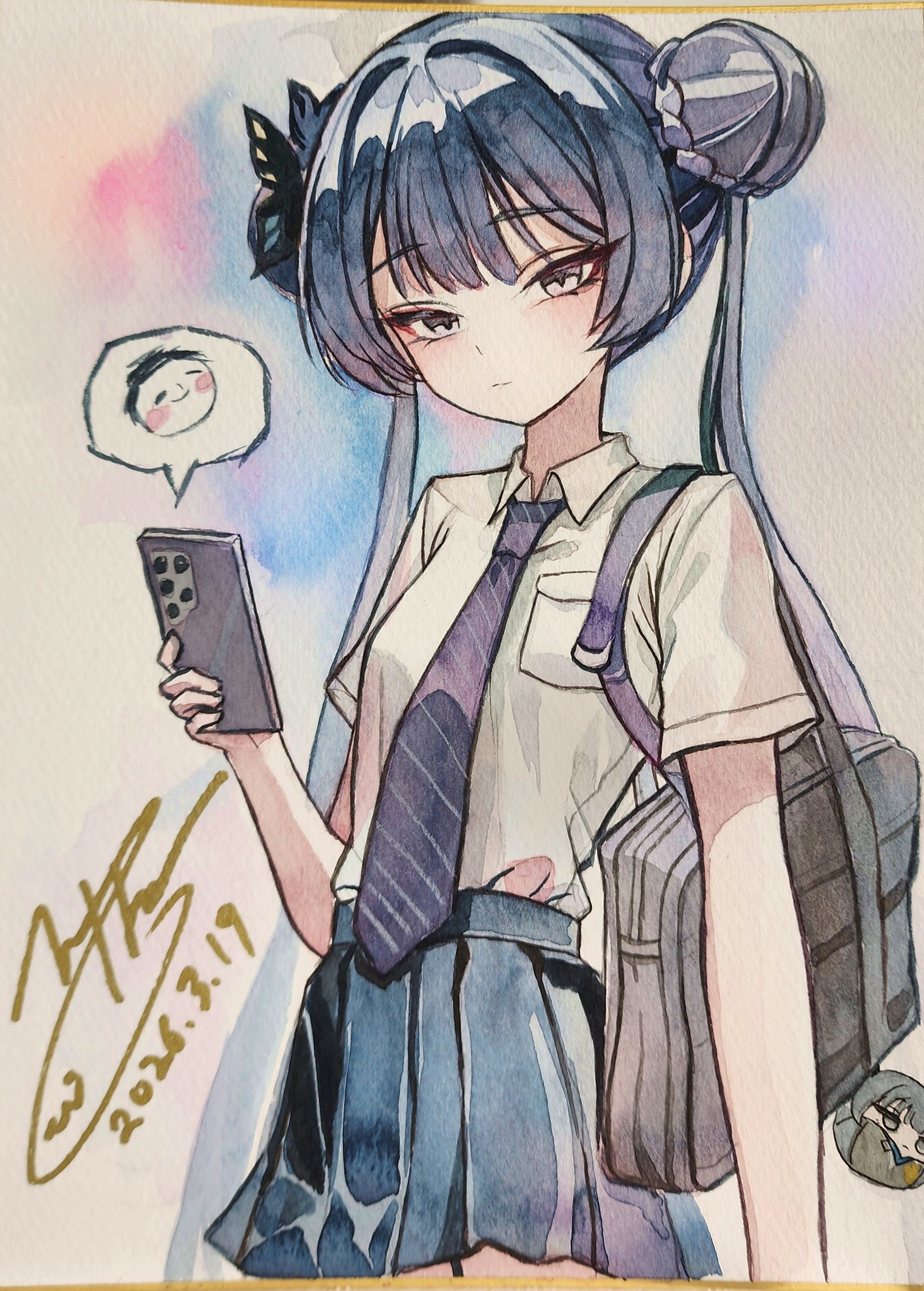 1girl absurdres bag black_hair black_necktie black_skirt blue_archive blush braid breast_pocket brown_bag bun_with_braided_base cellphone closed_mouth commentary dated diagonal-striped_clothes diagonal-striped_necktie doodle_sensei_(blue_archive) double_bun gangbyeon grey_eyes hair_bun hand_up highres holding holding_phone kisaki_(blue_archive) kisaki_(school_uniform)_(blue_archive) looking_at_viewer necktie official_alternate_costume painting_(medium) phone pleated_skirt pocket sensei_(blue_archive) shirt shirt_tucked_in signature skirt solo striped_clothes traditional_media twintails watercolor_(medium) white_shirt