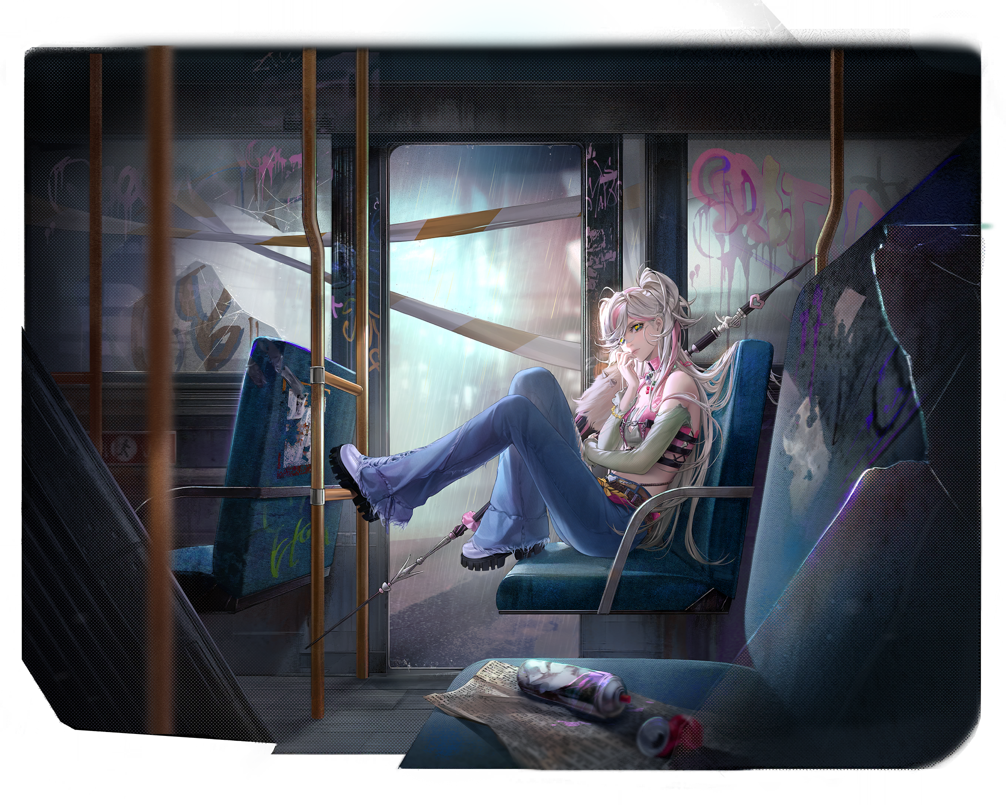 1girl arm_rest artist_request bare_shoulders bell-bottoms blonde_hair broken_glass bus_interior choker denim glass golan_(path_to_nowhere) graffiti hand_on_own_cheek hand_on_own_face highres jeans multicolored_hair multicolored_skirt newspaper off-shoulder_shirt off_shoulder official_art pants path_to_nowhere pink_choker pink_streaks polearm rain shirt shoes sitting skirt spear spray_can spray_paint streaked_hair two_side_up weapon white_shoes yellow_eyes