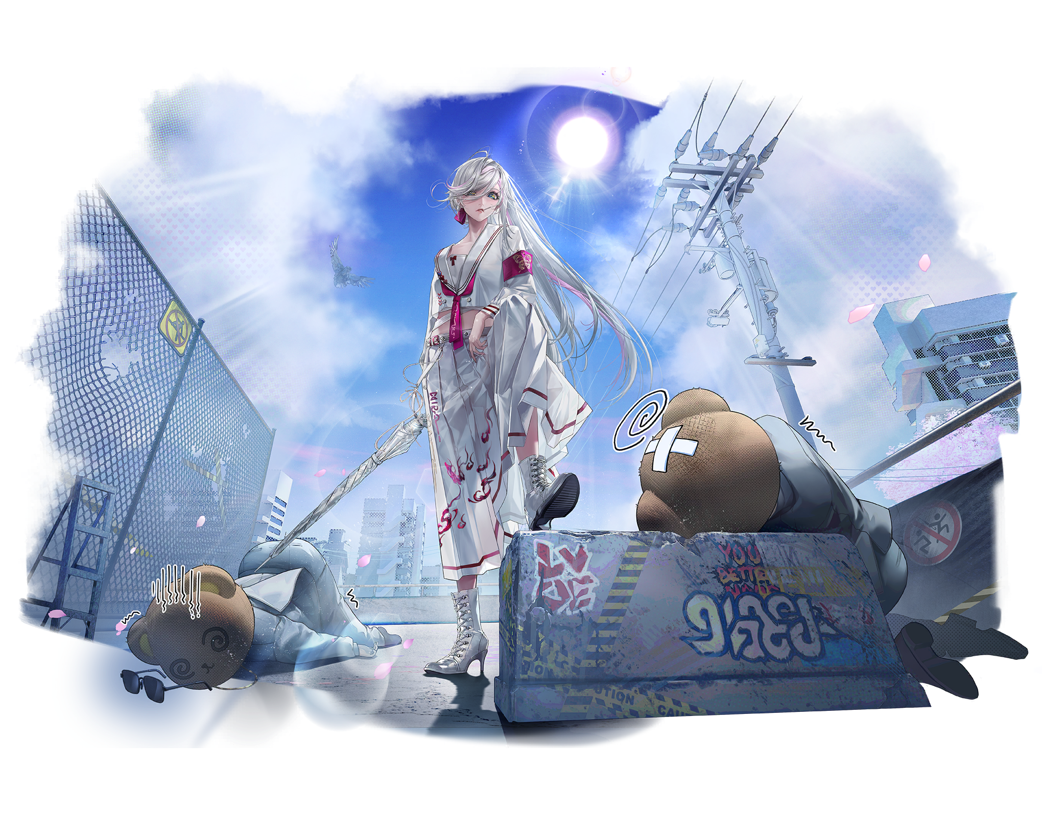 1girl 2boys @_@ arm_on_own_leg armband artist_request bandaid bandaid_on_head bear_mask bird chain-link_fence cloud crossed_bandaids day delinquent falling_petals fence golan_(path_to_nowhere) hair_over_one_eye high_heels highres lens_flare long_hair mask multicolored_hair multiple_boys official_alternate_costume path_to_nowhere petals pink_armband pink_streaks power_lines shinai shirt shoes skirt streaked_hair sukeban sun sunglasses sunlight sword toothpick transformer unworn_eyewear utility_pole very_long_hair weapon white_shirt white_shoes white_skirt yellow_eyes