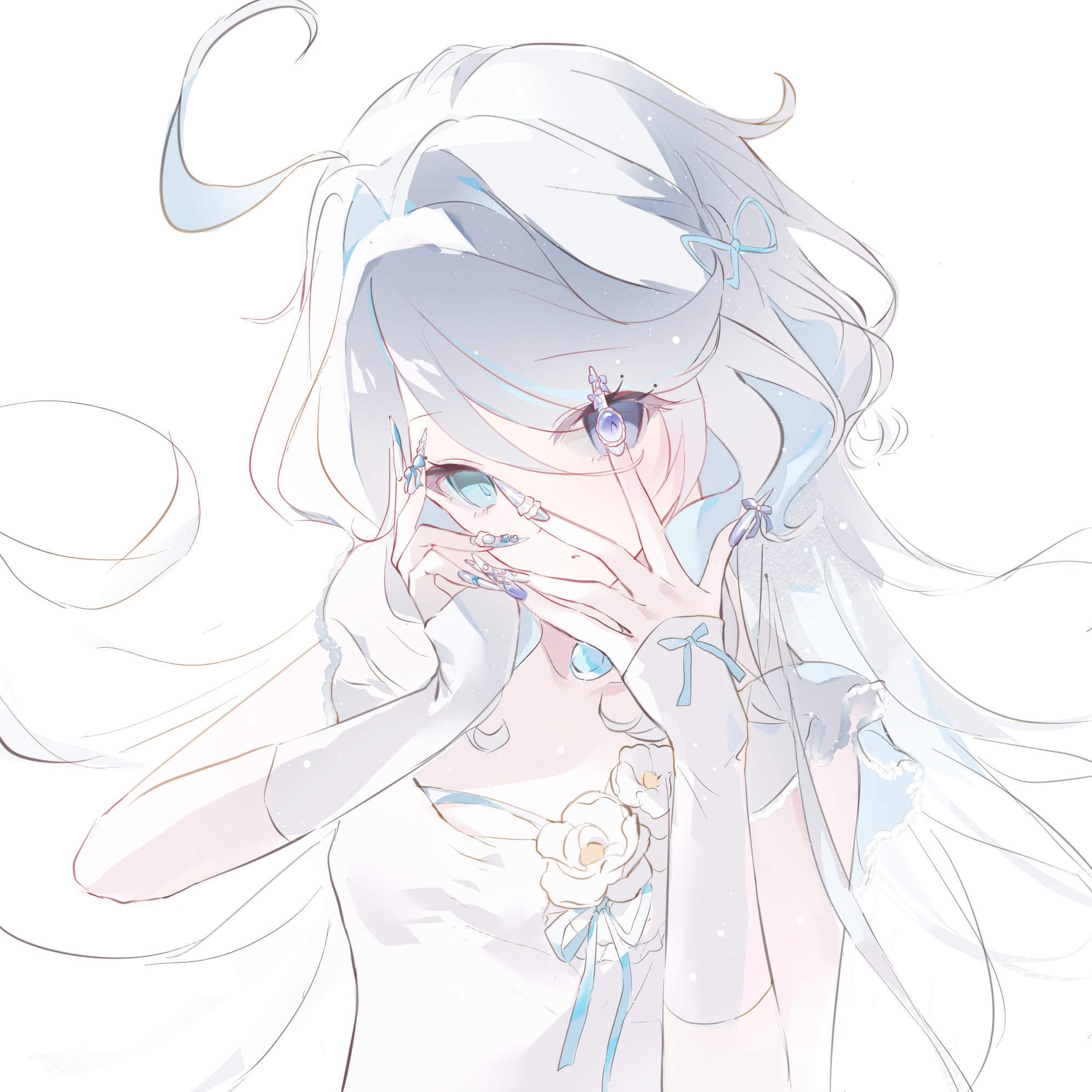 1girl ahoge aqua_eyes aqua_hair aqua_nails blue_eyes blue_hair blue_nails blue_ribbon breasts chinese_commentary claw_ring closed_mouth colored_inner_hair commentary_request dress dress_flower facepalm fingerless_gloves fingernails floating_hair flower furina_(genshin_impact) genshin_impact glove_bow gloves hair_ribbon hair_spread_out hands_on_own_face hands_up heterochromia highres jellyfish_cut jiayun94769 long_fingernails long_hair multicolored_hair nail_polish profile puffy_sleeves ribbon short_sleeves simple_background small_breasts solo two-tone_hair upper_body white_background white_dress white_gloves white_hair white_sleeves