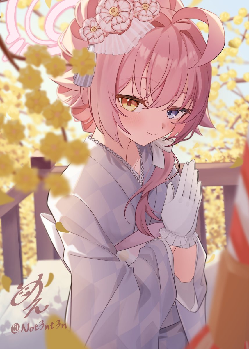 1girl ahoge blue_archive blue_eyes blurry blush checkered_clothes closed_mouth depth_of_field flower frills gloves hair_bun hair_flower hair_ornament halo heterochromia highres hoshino_(blue_archive) japanese_clothes kimono long_hair long_sleeves looking_at_viewer noten_(notententen) obi outdoors own_hands_together pink_hair sash signature smile solo twitter_username upper_body white_gloves wide_sleeves yellow_eyes