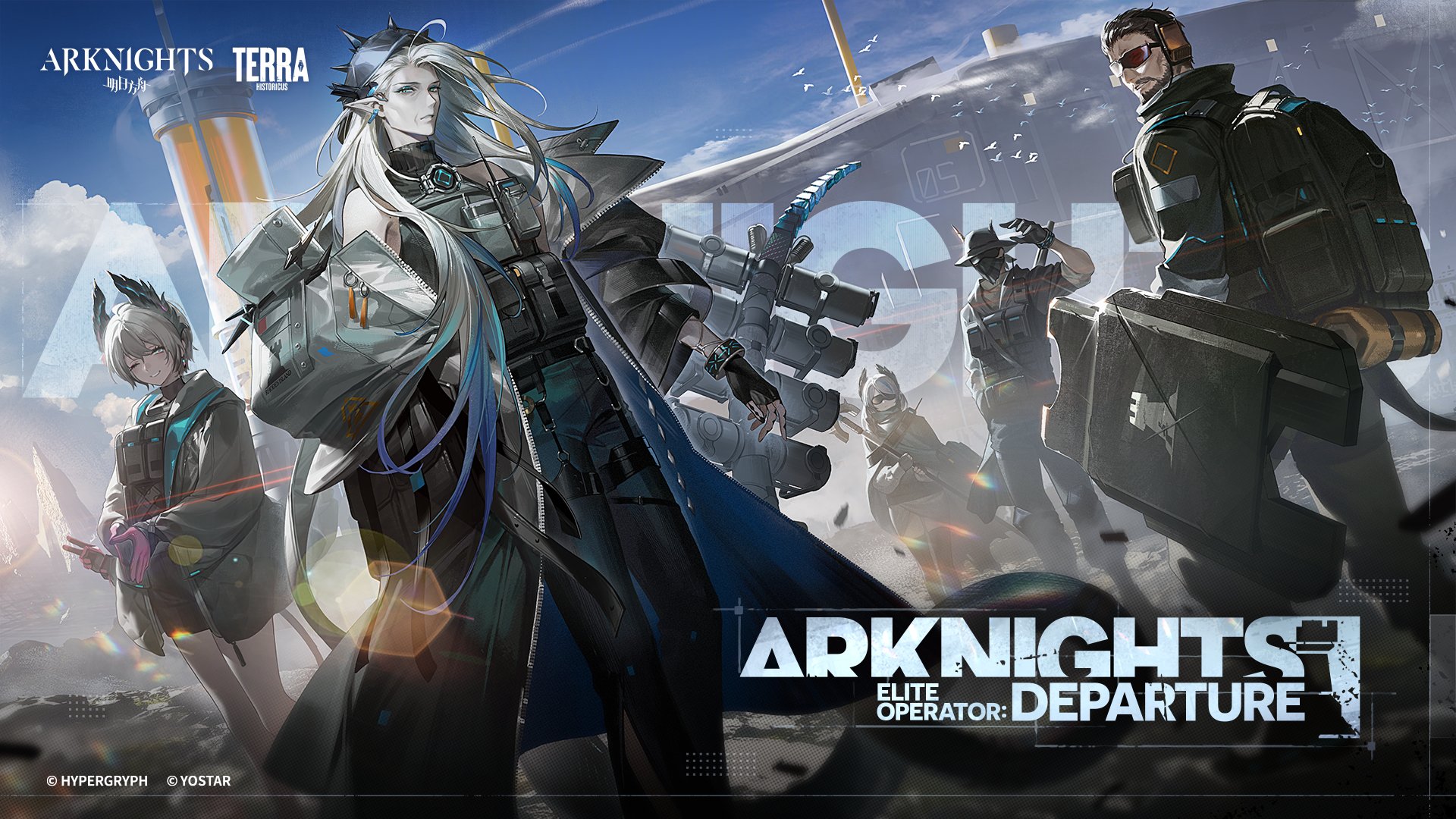 2boys 3girls ace_(arknights) arknights bag bird glasses grey_hair hat highres horns landship mantra_(arknights) multiple_boys multiple_girls official_art pith_(arknights) raidian_(arknights) rhodes_island_landship rhodes_island_logo_(arknights) scout_(arknights) sky tagme tail weapon white_hair wings