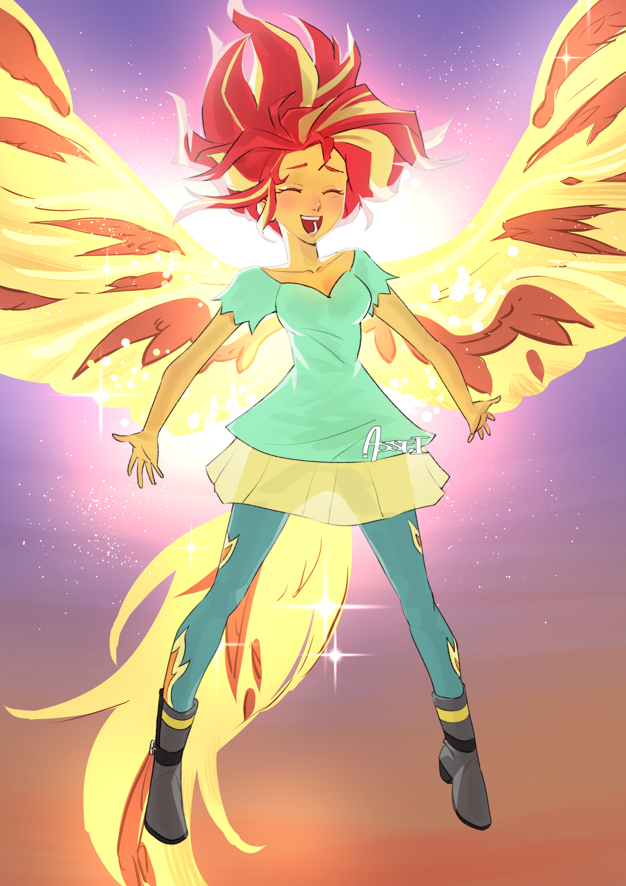 1girl absurdres artist_name asseiiy blush boots closed_eyes collarbone colored_skin commentary curly_hair dawn dress_shirt english_commentary equestria_girls:_rainbow_rocks excited fiery_wings floating_hair flying full_body glowing gradient_background gradient_sky hair_floating_upwards happy highres light_particles long_sleeves multicolored_hair my_little_pony my_little_pony:_equestria_girls my_little_pony:_friendship_is_magic open_mouth pants powering_up red_hair shirt short_sleeves sky smile solo spoilers streaked_hair sunset sunset_shimmer sunset_shimmer_(human) wavy_hair wings yellow_skin
