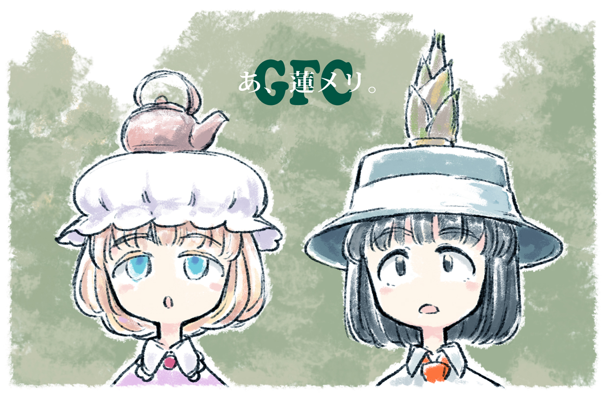 2girls bamboo_shoot black_eyes black_hair black_hat blonde_hair blue_eyes blush_stickers collared_shirt commentary contrast_collar dress frilled_shirt_collar frills ghostly_field_club hat looking_up maribel_hearn mob_cap multiple_girls necktie object_on_head open_mouth purple_dress red_necktie shirt short_hair tataragawa_daini teapot teapot_on_head touhou translated usami_renko white_hat white_shirt