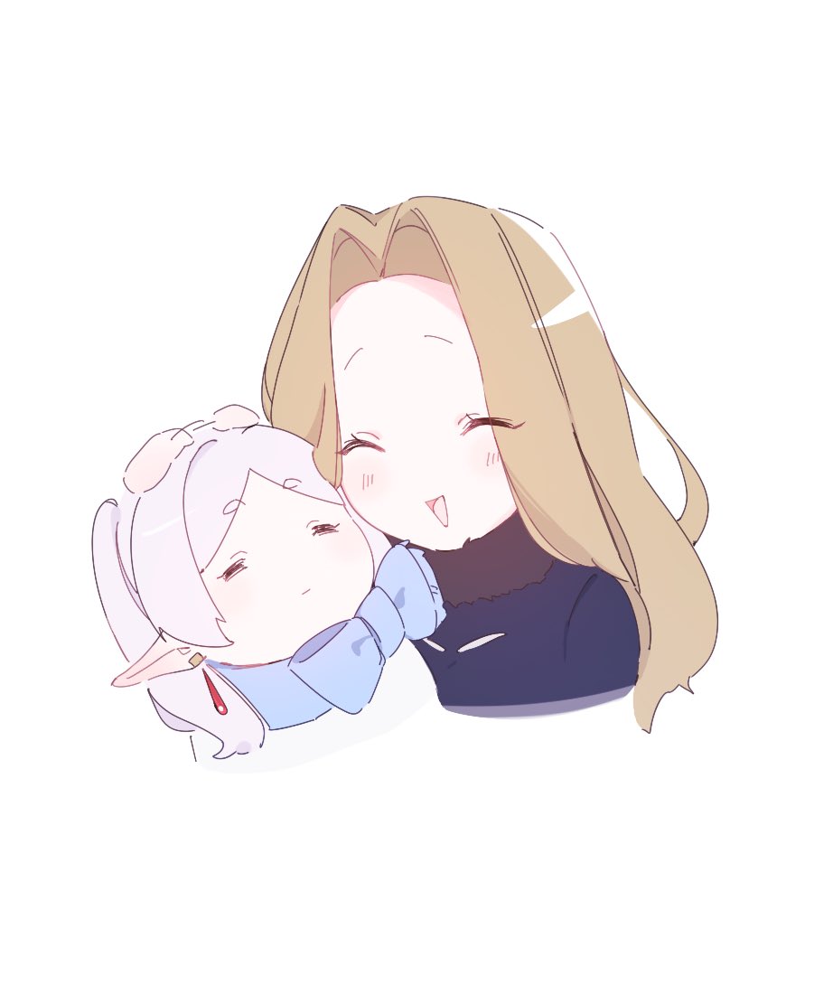 2girls black_coat blonde_hair blue_scarf closed_eyes closed_mouth coat commentary_request earrings elf frieren fur-trimmed_coat fur_collar fur_trim jewelry long_hair methode_(sousou_no_frieren) multiple_girls open_mouth pointy_ears sarano_814 scarf sousou_no_frieren twintails white_coat white_hair