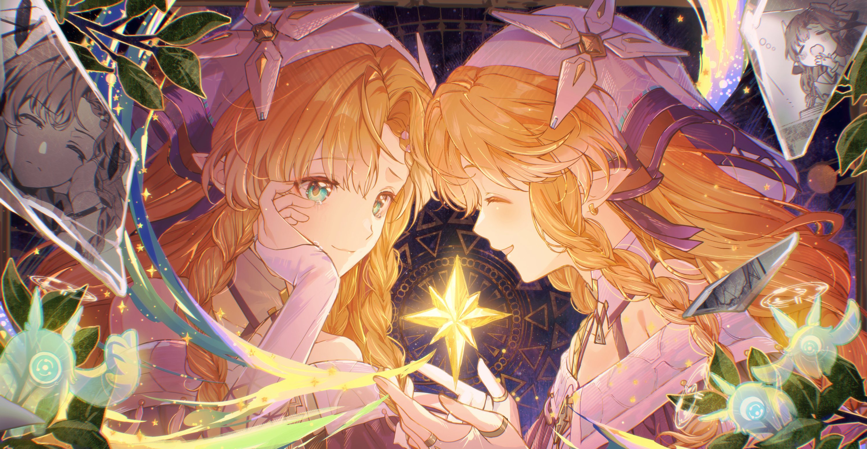 2girls braid braided_sidelocks closed_eyes closed_mouth commentary_request dual_persona gloves green_eyes hand_up highres long_hair multiple_girls multiple_views open_mouth orange_hair pointy_ears sidelocks sigrika_(wuthering_waves) smile soliskin_(wuthering_waves) veil white_gloves white_veil wuthering_waves zassyoku_dd