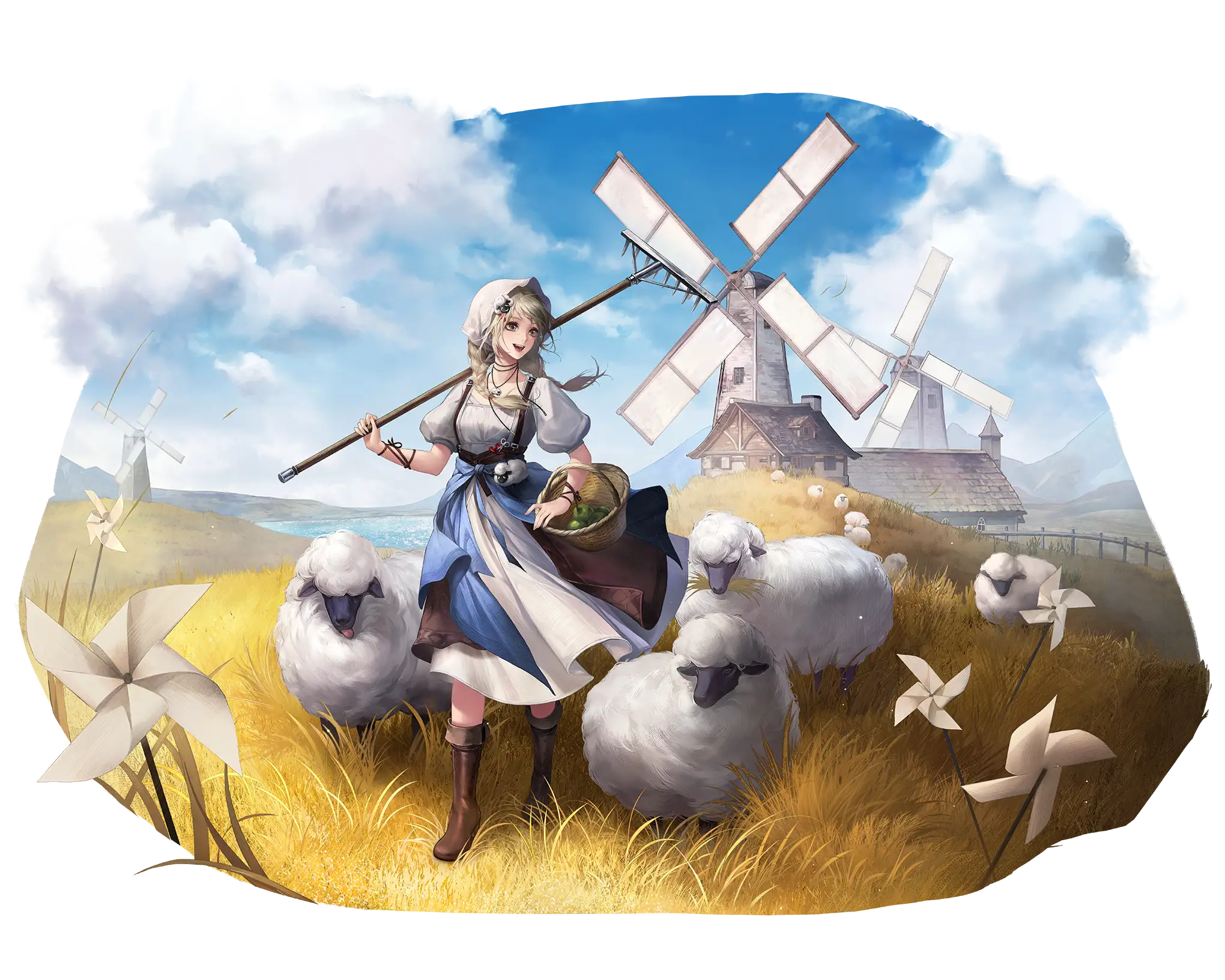 1girl animal_charm apple artist_request blonde_hair boots braid brown_boots charm_(object) cloud day eating fence field food fruit grasslands green_apple hair_ornament highres hill holding_rake lake official_alternate_costume official_art open_mouth outdoors path_to_nowhere pepper_(path_to_nowhere) pinwheel rake sheep sheep_charm sheep_hair_ornament twin_braids white_coif wicker_basket windmill wooden_fence