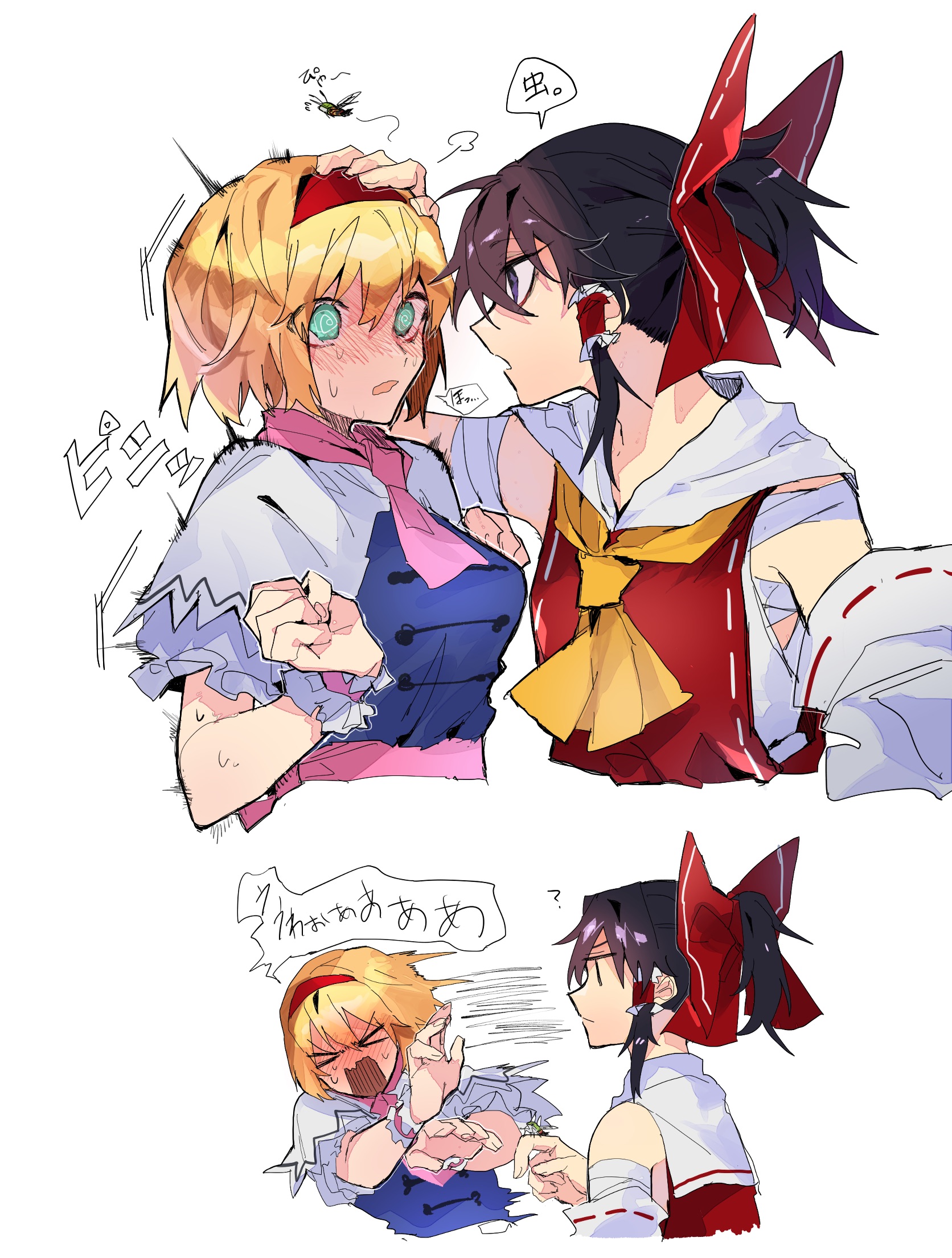 >_< 2girls ? @_@ alice_margatroid arm_up arms_up ascot bandages bare_shoulders belt black_eyes blonde_hair blue_dress blue_eyes blush bow breasts brown_hair bug cape check_translation closed_eyes closed_mouth collar collared_dress commentary_request detached_sleeves dress eyes_visible_through_hair flying fuuga_(perv_rsity) hair_between_eyes hair_bow hair_ornament hair_tubes hairband hakurei_reimu hand_on_another's_head hand_up hands_up highres long_sleeves looking_at_another medium_breasts multiple_girls open_mouth pink_ascot pink_belt pink_nails purple_eyes red_bow red_dress red_hairband short_hair short_sleeves standing touhou translation_request white_cape wide_sleeves wings wrist_cuffs yellow_ascot yuri