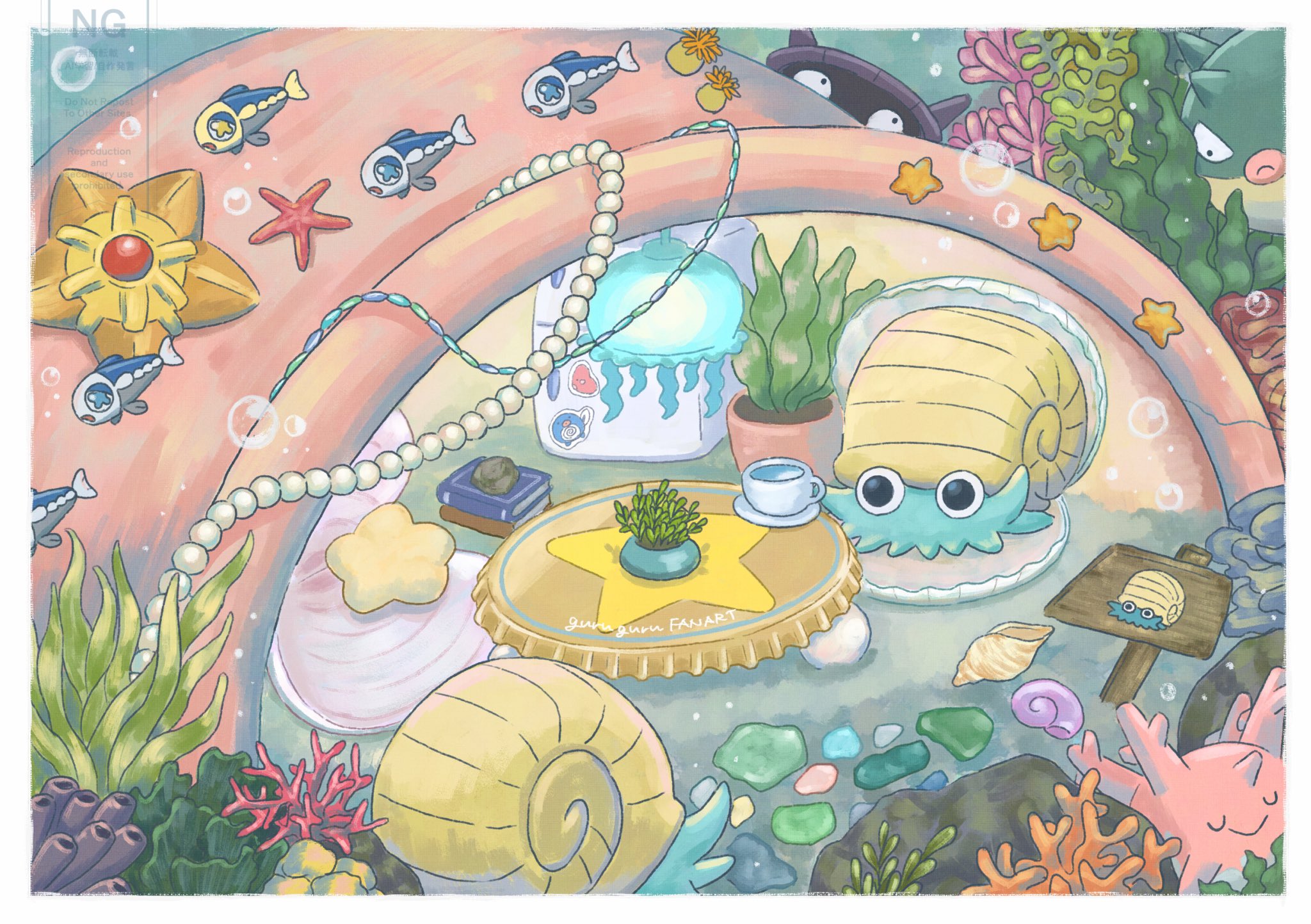 air_bubble alternate_color artist_name beads book book_stack bubble chair clam_shell closed_eyes closed_mouth coffee_mug conch coral corsola cup fish flower_pot gem gen_1_pokemon gen_2_pokemon gen_3_pokemon gen_7_pokemon hanging_light highres house kelp luvdisc mug nintendo no_humans omanyte omochi_(aoi_guruguru) pearl_(gemstone) pillow plant pokemon pokemon_(creature) poliwag potted_plant qwilfish refrigerator rock round_table saucer sea_anemone seashell seaweed shell shellder shiny_and_normal shiny_pokemon sign signature smile star-shaped_pillow star_(symbol) starfish staryu table u_u underwater vase watermark wishiwashi wishiwashi_(solo)