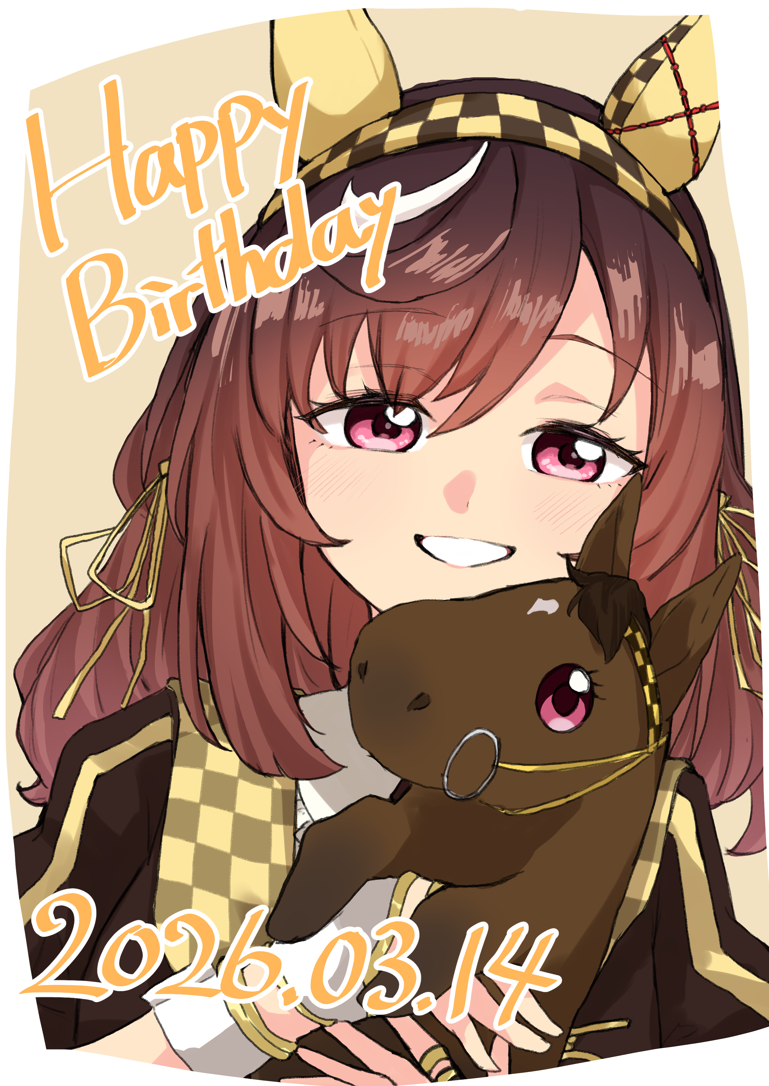 1girl absurdres animal_ears birthday blush border brown_background brown_hair buena_vista_(heroina_inocente)_(umamusume) buena_vista_(racehorse) buena_vista_(umamusume) checkered_collar checkered_hairband commentary_request creature_and_personification ear_covers gloves hairband happy_birthday highres horse horse_ears horse_girl looking_at_viewer muchi3333 personification purple_eyes real_life simple_background smile umamusume upper_body white_border white_gloves