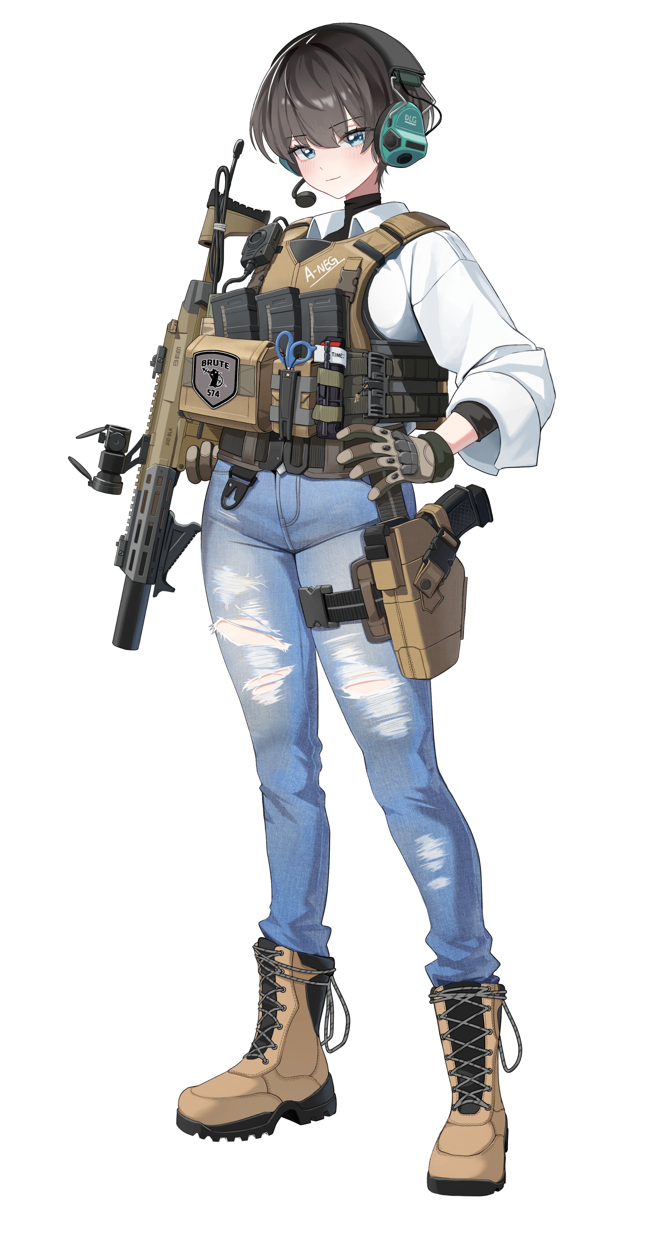 1girl absurdres black_hair blue_eyes blue_pants boots brown_boots brown_gloves buckle bulletproof_vest closed_mouth collared_shirt commentary denim dolgom dress_shirt english_commentary full_body gloves gun hair_between_eyes hand_on_own_hip handgun headphones highres holster holstered jeans lace-up_boots light_blush light_smile load_bearing_equipment looking_at_viewer magazine_(weapon) microphone original pants scissors scope shirt short_hair simple_background sleeves_rolled_up snap-fit_buckle solo suppressor thigh_holster thigh_strap torn_clothes torn_jeans torn_pants weapon weapon_request white_background white_shirt