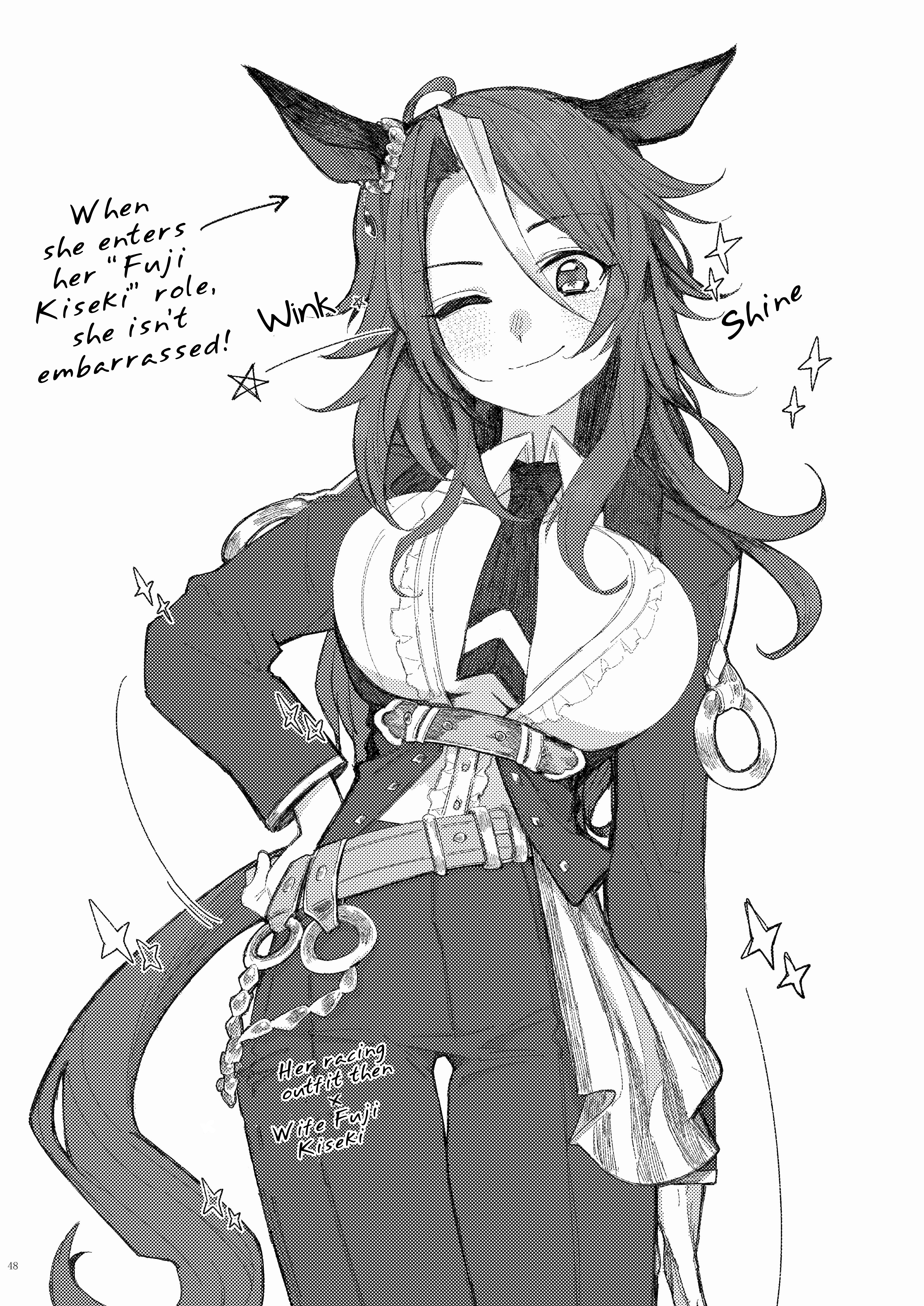 1girl absurdres animal_ears belt blush breasts closed_mouth dot_nose ear_ornament english_text female_focus fuji_kiseki_(shooting_star_revue)_(umamusume) fuji_kiseki_(umamusume) hand_on_own_hip highres horse_ears horse_girl horse_tail huge_filesize large_breasts long_hair long_sleeves monochrome necktie one_eye_closed pants ranguage shirt_tucked_in smile solo solo_focus tail translated umamusume wink