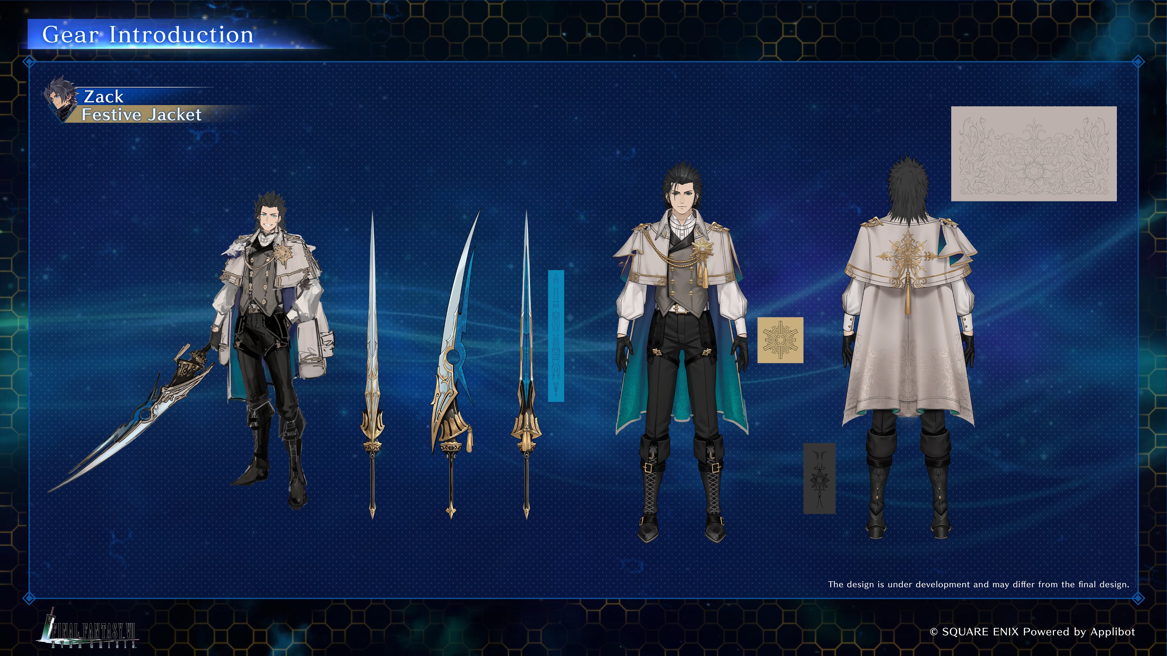1boy a-pose absurdres belt black_gloves black_hair black_pants blue_eyes boots buttons cape capelet character_name commentary double-breasted english_commentary final_fantasy final_fantasy_vii final_fantasy_vii:_ever_crisis full_body gloves grey_vest hair_slicked_back highres knee_boots long_sleeves multiple_views pants reference_sheet shirt short_hair sword turnaround tuxedo_shirt two-sided_cape two-sided_fabric vest weapon white_shirt zack_fair zack_fair_(festive_jacket)
