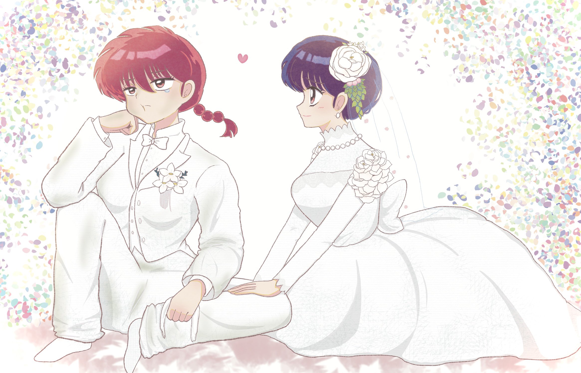 2girls :t blue_hair bow bowtie braid bridal_veil bride closed_mouth commentary_request crossdressing crossdressing_(ftm) dress female_focus flower formal_clothes groom hair_flower hair_ornament head_rest highres moriya_erichish multiple_girls pink_eyes pink_hair ranma-chan ranma_1/2 short_hair single_braid sitting suit tendou_akane veil wedding_dress white_bow white_bowtie white_dress white_flower white_suit wife_and_wife yuri