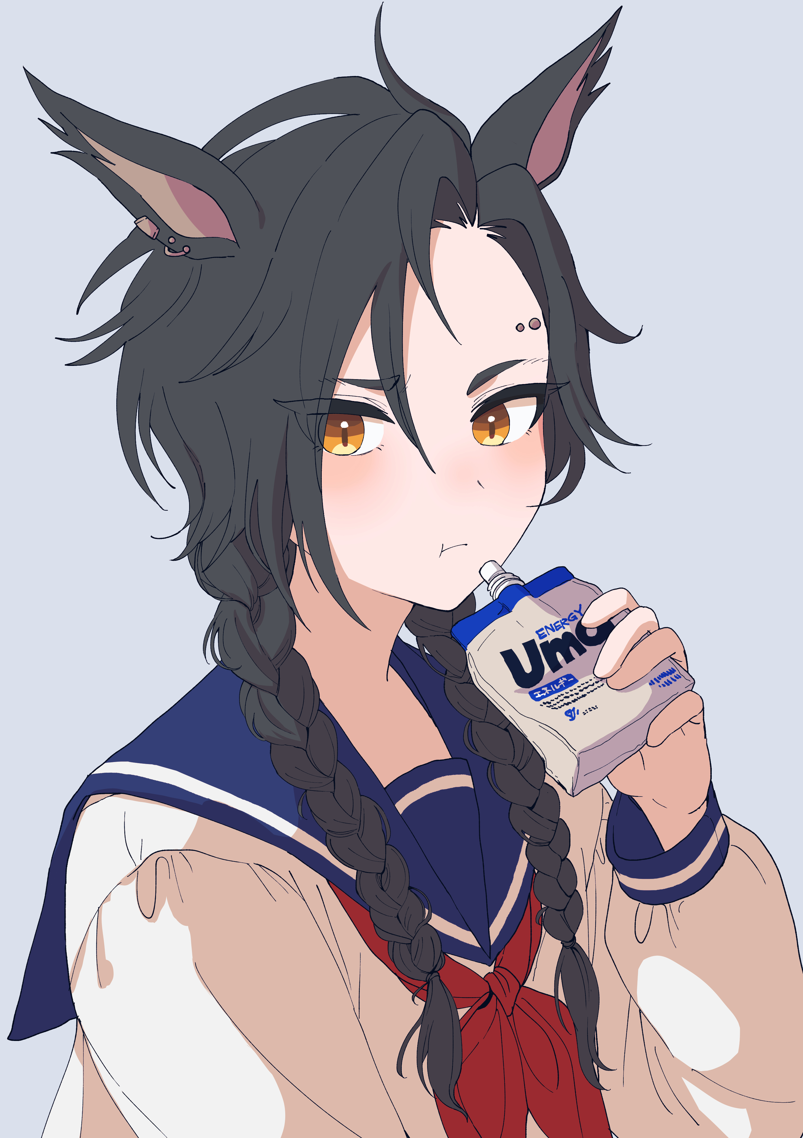 1girl :t absurdres air_shakur_(umamusume) alternate_costume alternate_hairstyle animal_ears asymmetrical_bangs black_hair braid braided_twintails closed_mouth commentary_request drink drink_pouch ear_piercing eyebrow_piercing face_piercing grey_background highres holding holding_drink horse_ears horse_girl long_hair looking_at_viewer neckerchief orange_eyes piercing red_neckerchief sailor_collar samedonburi school_uniform shirt simple_background solo umamusume upper_body white_shirt