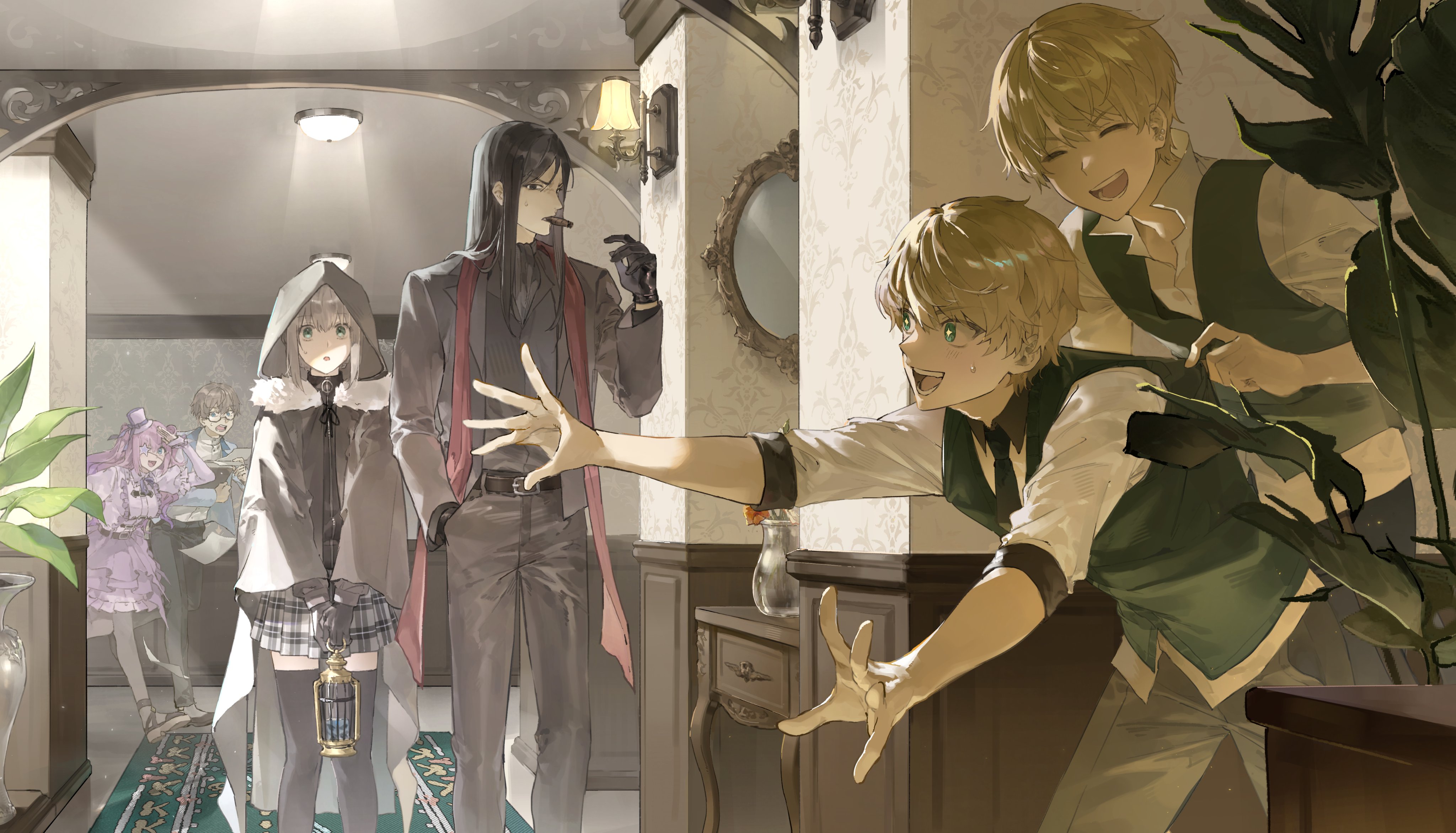 2girls 4boys ^_^ absurdres black_gloves black_hair black_thighhighs blonde_hair brown_cloak brown_hair brown_pants cage carpet caules_forvedge_yggdmillennia ceiling_light cigar cloak closed_eyes commentary_request fate_(series) flat_escardos glasses gloves gray_(fate) green_carpet green_vest grey_hair hand_in_pocket hat highres holding holding_cage hood hood_up hooded_cloak indoors korean_commentary lord_el-melloi_ii lord_el-melloi_ii_case_files mini_hat mini_top_hat mirror mouth_hold multiple_boys multiple_girls pants pink_hair plaid_clothes plaid_skirt plant pleated_skirt potato_goril red_scarf scarf shirt skirt small_sweatdrop sparkling_eyes star_eyepatch svin_glascheit thighhighs top_hat vase vest wall_lamp waver_velvet white_shirt yvette_l._lehrman