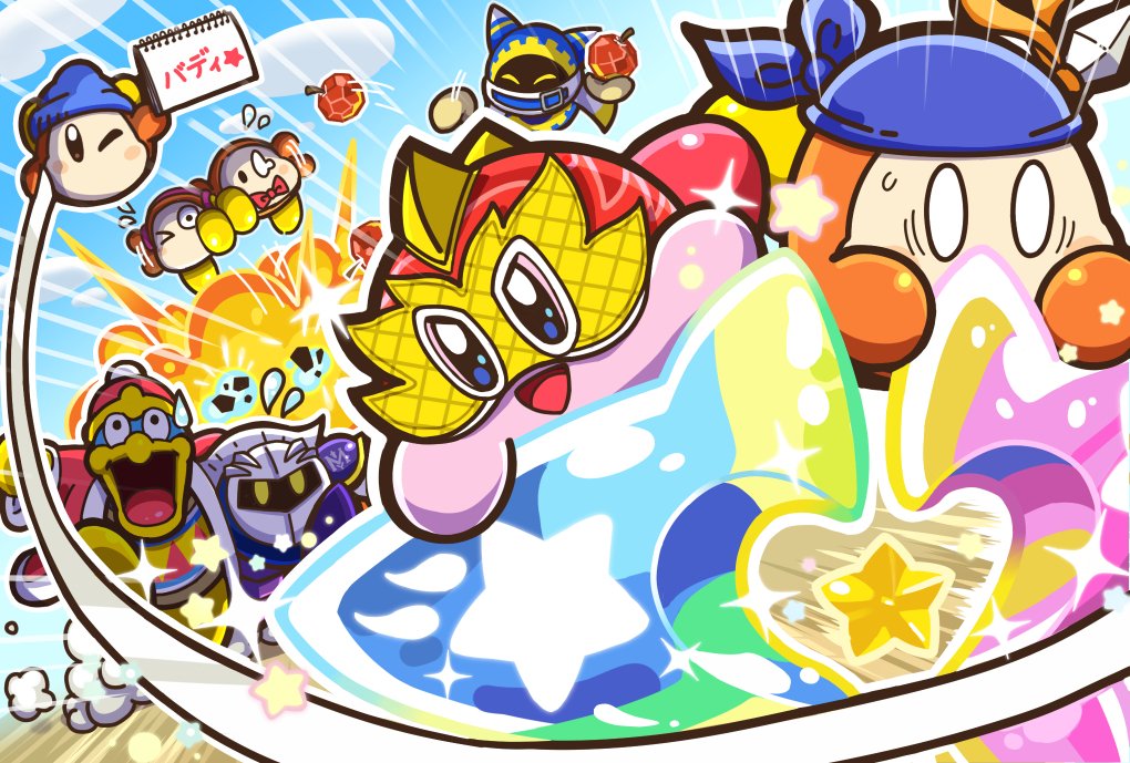armor bandana bandana_waddle_dee beanie blue_bandana blue_hat blue_sky blush_stickers bow bowtie buddy_star_blaster channel_ppp colored_skin comedic_sweatdrop commentary_request emphasis_lines explosion flying_sweatdrops gem_apple hat king_dedede kirby kirby_(series) kirby_fighters_2 luchador_mask magolor mask meta_knight nintendo official_art open_mouth pauldrons pink_skin polearm rayman_limbs red_bow red_bowtie shoulder_armor sketchbook sky sparkle spear star_(symbol) waddle_dee weapon wrestler_kirby